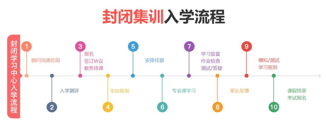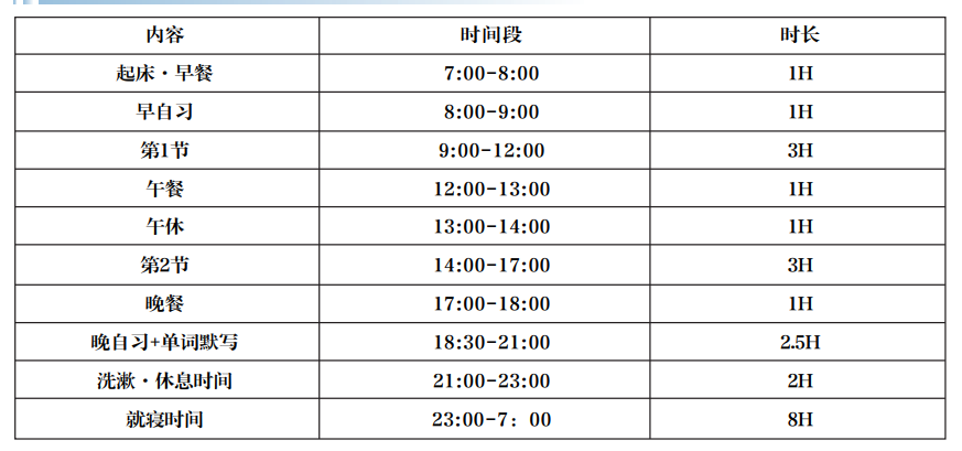 封闭学习中心除每天4-6个小时的正课之外,安排了早自习1个小时、晚自习1-2个小时,辅导课1-3个小时,一天10个小时左右的学习时间,从早到晚,安排满满,课时量更大,学习时间更长,训练更多,效果更好。