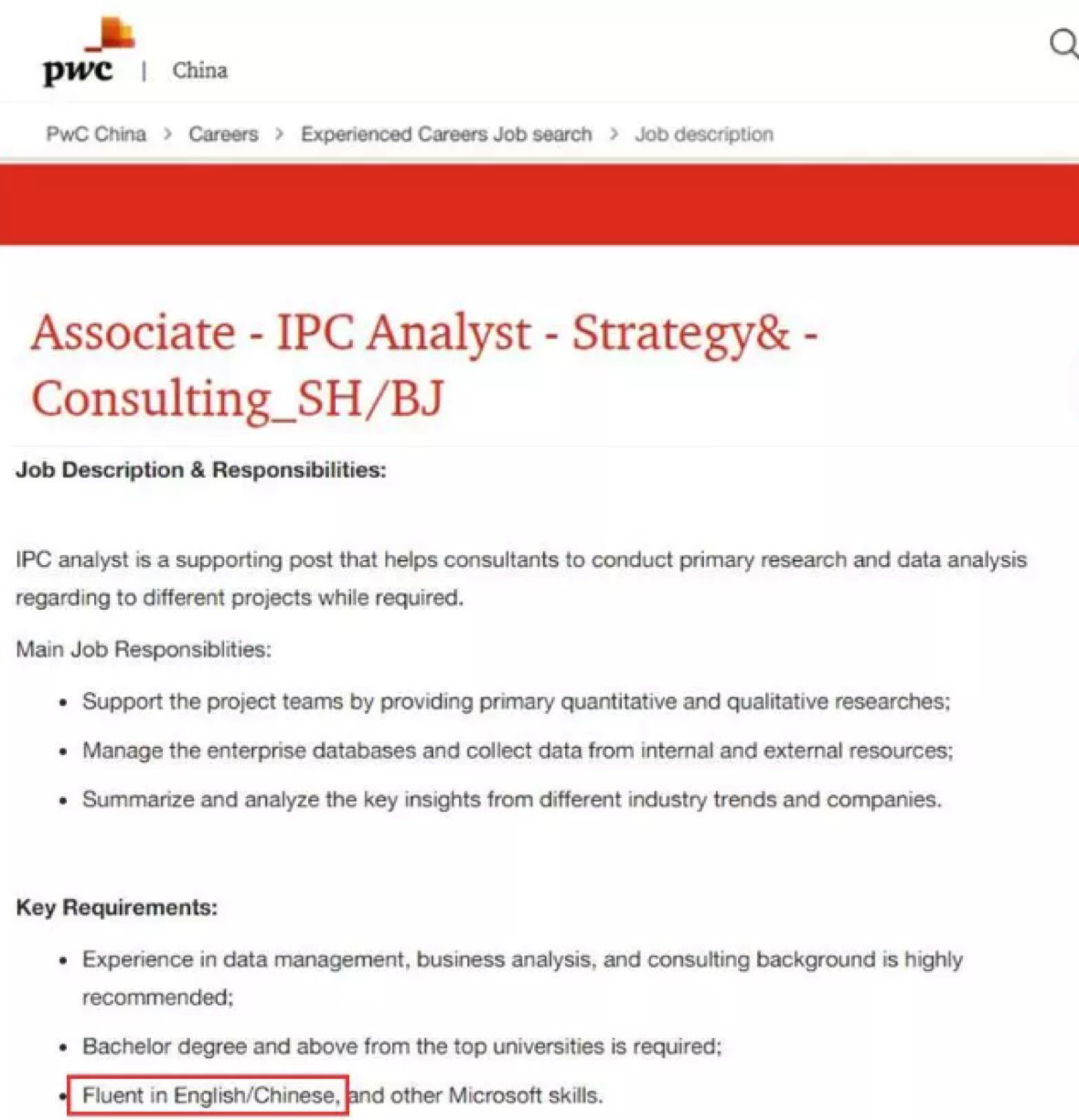 除了要在填写简历时要填写获得的英语证书之外,有些公司(普华永道、德勤、宝洁等)甚至连招聘的页面和测评都是全英文的。