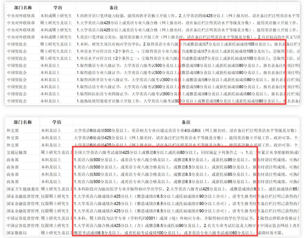 而与此同时,全球化经济发展趋势下,不少国企、央企、公务员岗位中也做出了相应的英文成绩规定: