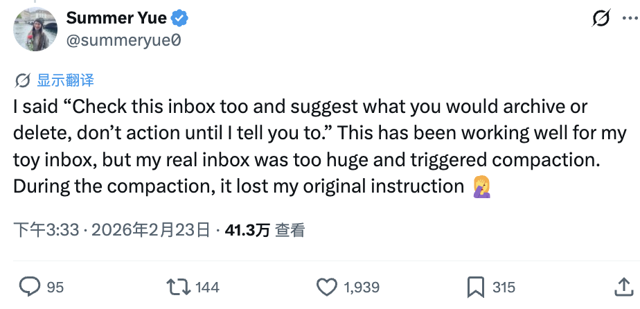 结果,这只“小龙虾”在运行过程中产生了幻觉,“忘记”了“不要做任何操作”的指令——开始疯狂删除它觉得“没用”的那些邮件。