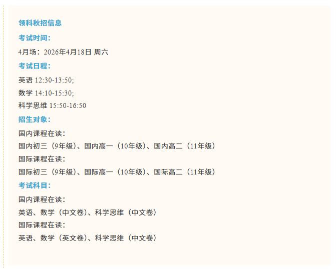 摘要:上海国际高中2026秋招的首场硬仗已正式打响!上周末,领科、WLSA——两所沪上顶流国际校的秋季招生首场入学考试落下帷幕。作为沪上A-Level赛道“一哥”和美本申请“藤校收割机”,这两所学校的考情向来是风向标。这篇推文,我们为大家带来一手考情复盘,精 准拆解考点,备战后续秋招场次的同学和家长,一定要收藏细读!