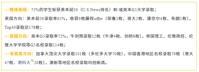 其中,A-Level方向45名学生中,80%获得英本G5预录取,英美双申学生同时斩获加州伯克利、埃默里等顶 尖名 校offer,充分体现双课程体系的升学优势。