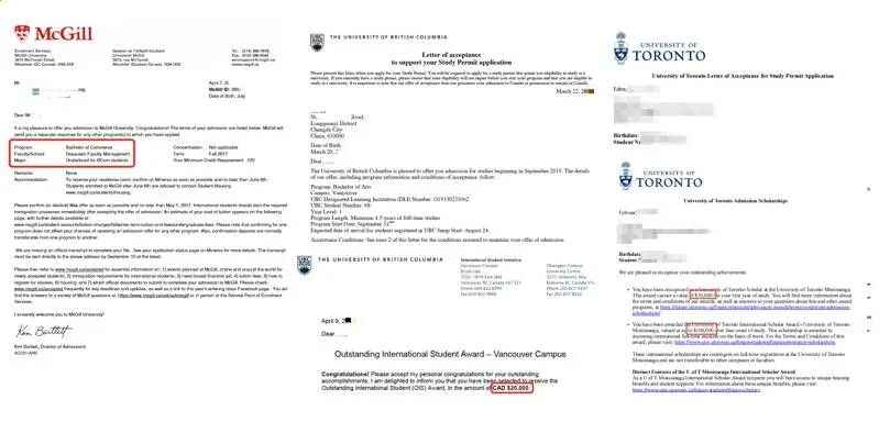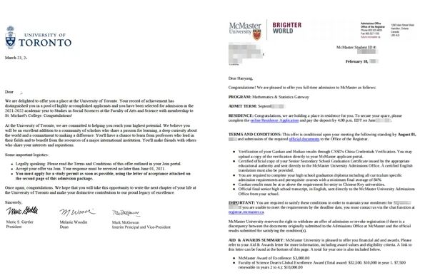 拿到了加拿大多伦多大学、麦克马斯特大学等名 校录取。