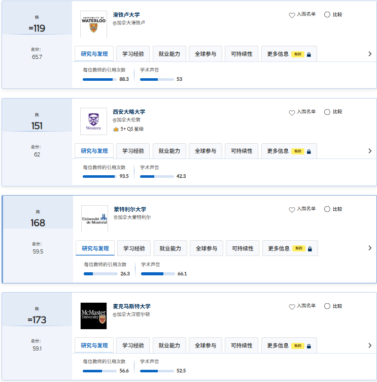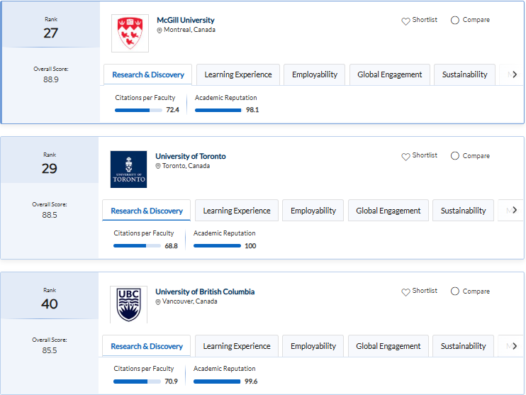 这三所学校稳居QS世界前50,学术实力、国际认可度与国内清北复交比肩,麦吉尔的医学、多伦多大学的商科、UBC的计算机,实力超强。