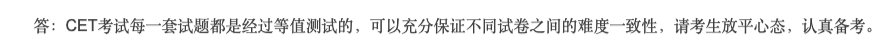 CET考试每一套试题都经过等值测试,可以充分保证不同试卷之间的难度一致。