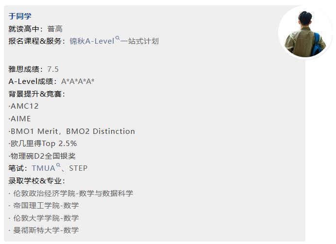 于同学的成功并非偶然,从专业定位、竞赛加持到文书打磨,每一步都离不开清晰的规划与高效执行。普高背景同样可以冲击世界名 校,关键在于早规划、找对路径。无论是A-Level课程选择、语言备考还是背景提升,系统性的准备才是制胜关键。如果你也怀揣留学梦想,不妨从现在开始,让每一步都走得笃定而从容。