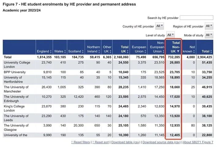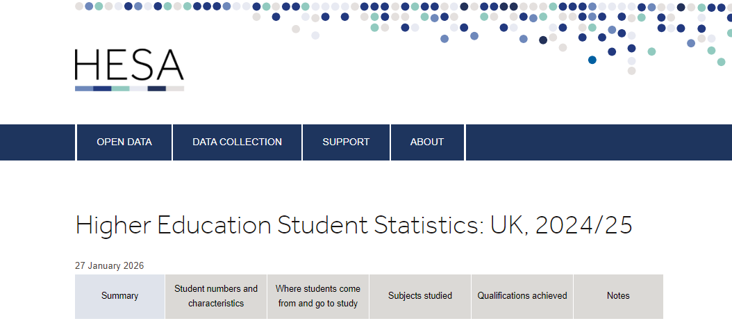 2024/25学年共有304所高校向HESA提交了学生数据,较上一年增加1所。其中,入学人数最多的五所大学分别是: