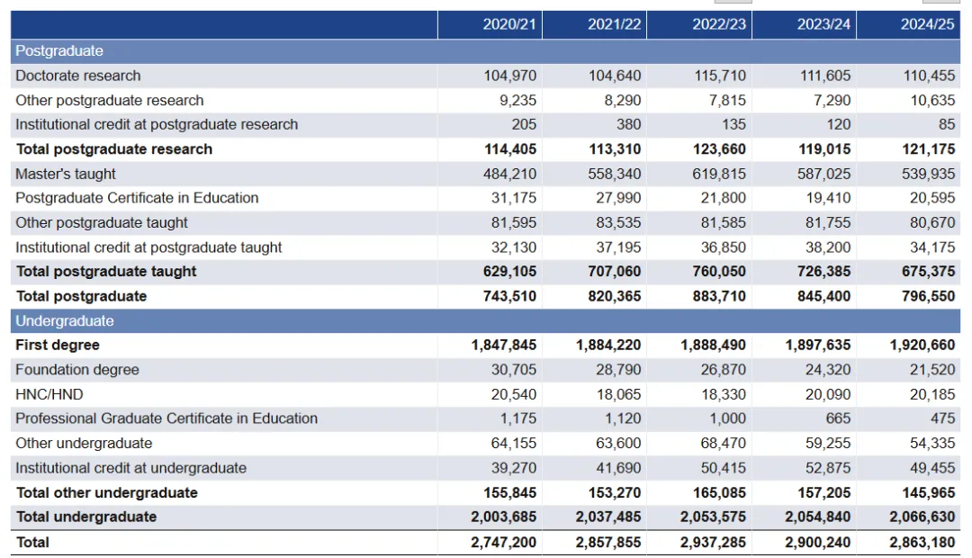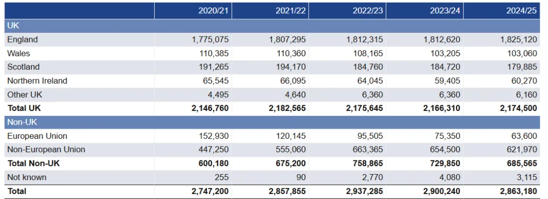 2024/25学年,英国高校总入学人数为2,863,180人,较上一年减少37,060人,降幅约1%。