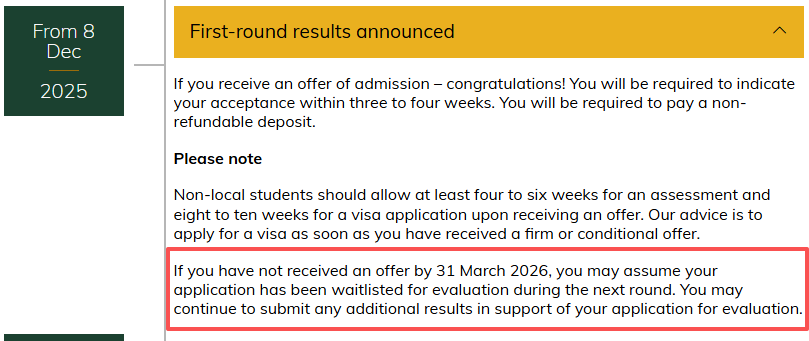 港大官方明确给出答案:2026年3月31日前未收到录取通知,申请自动进入候补等待名单(waitlist),并非直接被拒。