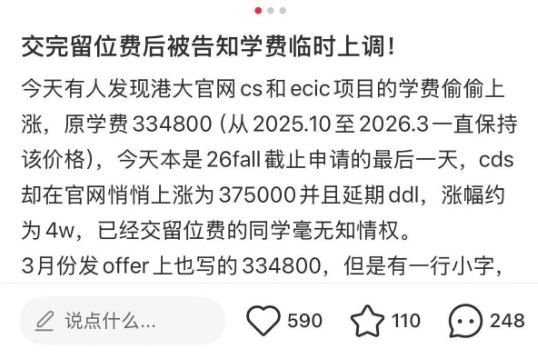 摘要:“港校最近真是不太平……”2026Fall香港留学圈彻底炸锅!继香港中文大学在录取通知中新增学校保留撤回offer权利的免责条款后,香港大学又曝出学费连夜临时上调的争议事件,引发大批已录取学生强烈不满,直呼港校“吃相难看”。4月1日,正值港大部分专业申请截止日,有学生意外发现CS、ECIC两大热门专业学费从334800港币悄然涨至375000港币,涨幅接近4万港币,且未通过任何官方渠道通知已录取学生。更让人无法接受的是,已交留位费的学生,大概率需要补交差价。