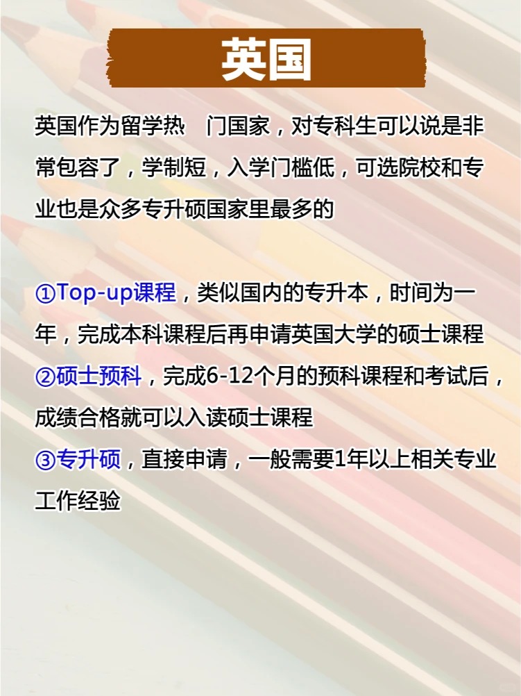 1⃣️英国 英国作为留学热 门国家,对专科生可以说是非常包容了,学制短,入学门槛低,可选院校和专业也是众多专升硕国家里最多的