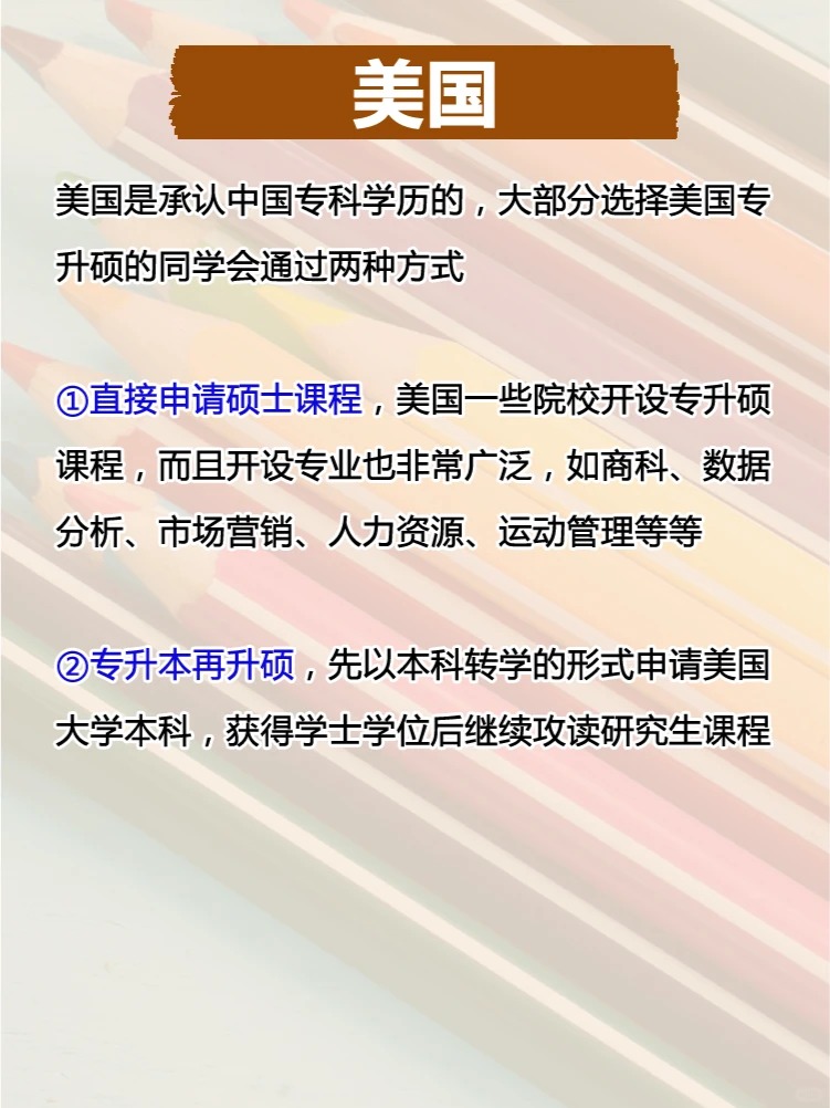2⃣️美国 美国是承认中国专科学历的,大部分选择美国专升硕的同学会通过两种方式