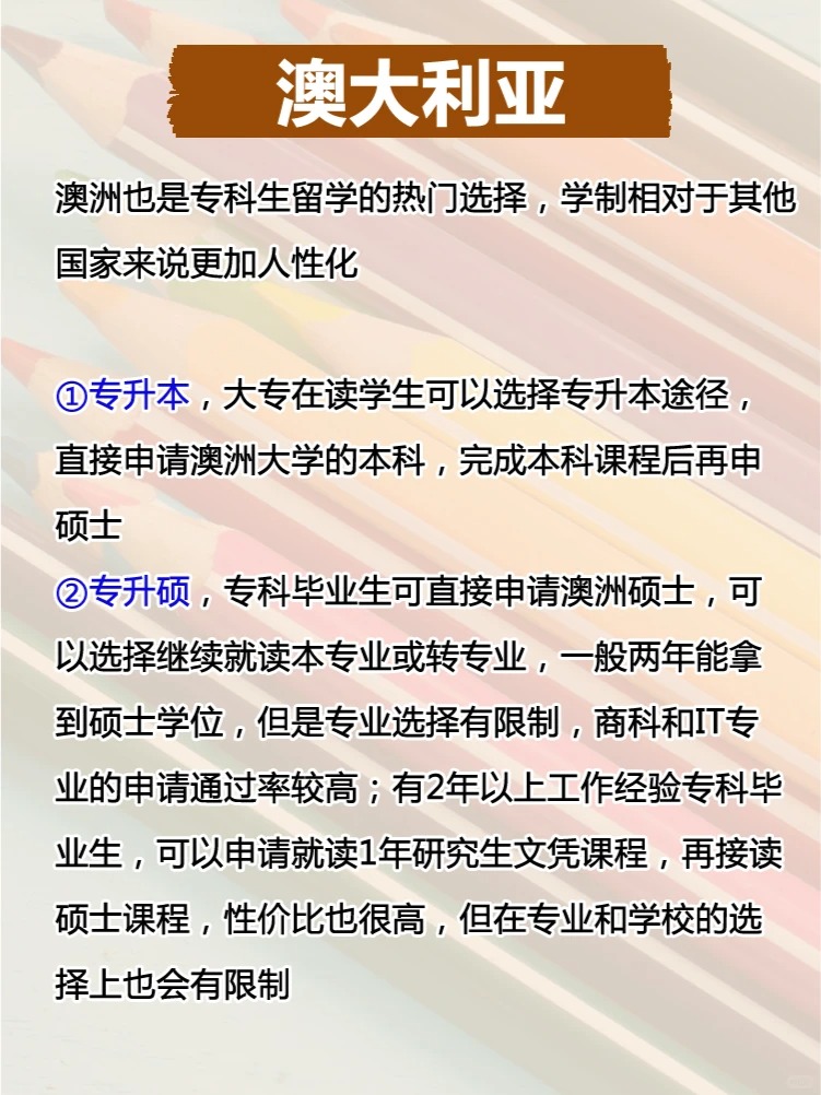 3⃣️澳大利亚 澳洲也是专科生留学的热门选择,学制相对于其他国家来说更加人性化