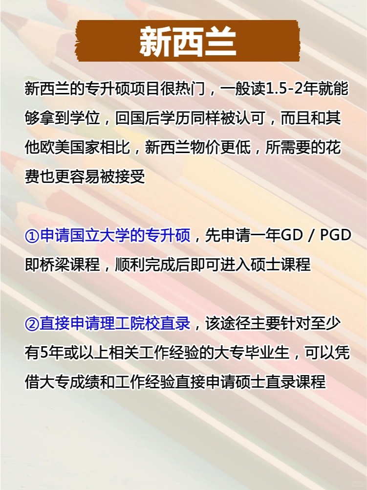 4⃣️新西兰 新西兰的专升硕项目很热门,一般读1.5-2年就能够拿到学位,回国后学历同样被认可,