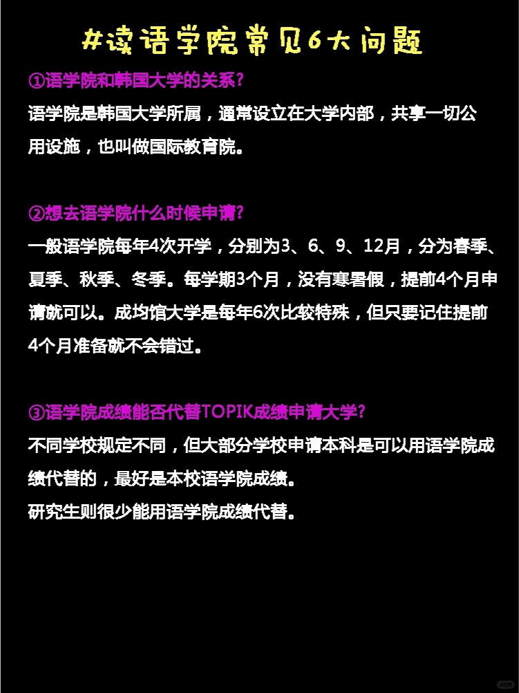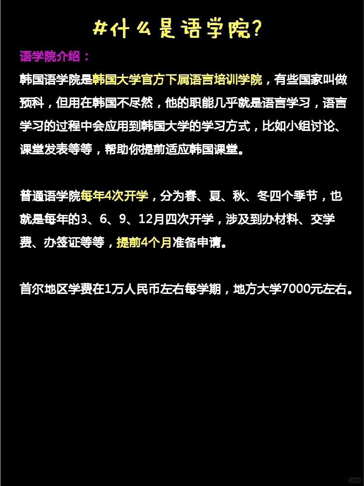 摘要:语学院是韩国大学下属的语言学习机构,毕业后不提供学历,但提供语言学习结业证,很多学校可以通过语学院结业证去申请。