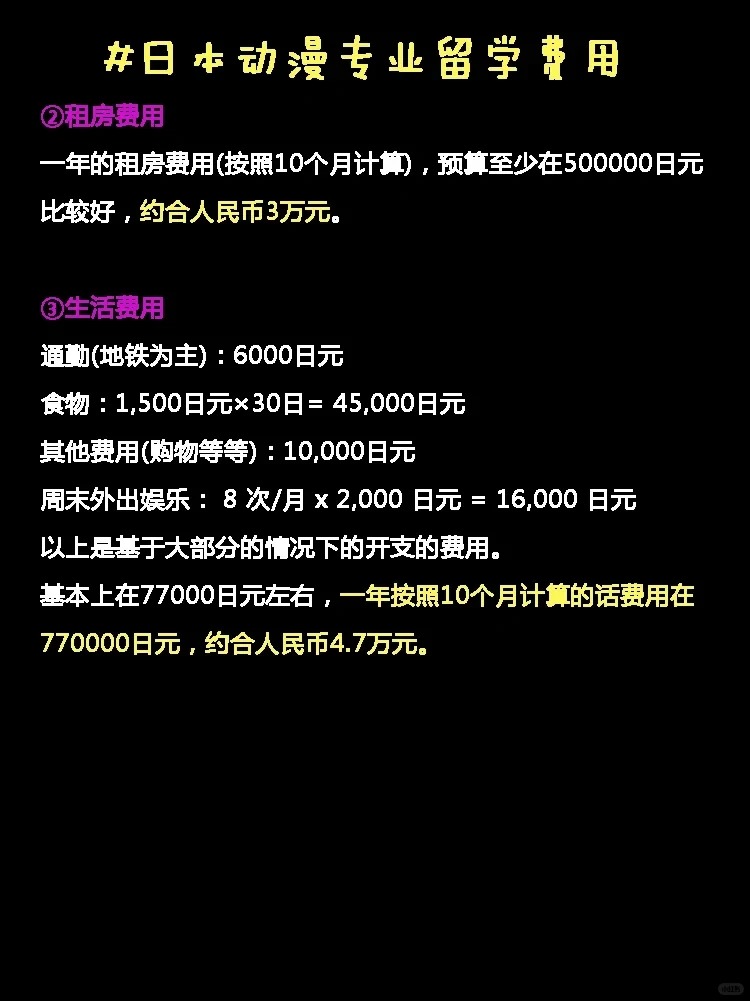 费用清单 一年留学费用:至少13万人民币。 ①学费: 一年平均下来预算准备至少5万元人民币 ②租房费用 一年的租房费用(按照10个月计算),预算至少在500000日元比较好,约合人民币3万元。 ③生活费用 通勤(地铁为主):6000日元 食物:1,500日元x30日=45,000日元 其他费用(购物等等):10,000日元 周末外出娱乐:8次/月x2,000日元=16,000日元 以上是基于大部分的情况下的开支的费用。 基本上在77000日元左右,一年按照10个月计算的话费用在770000日元,约合人民币4.7万元: