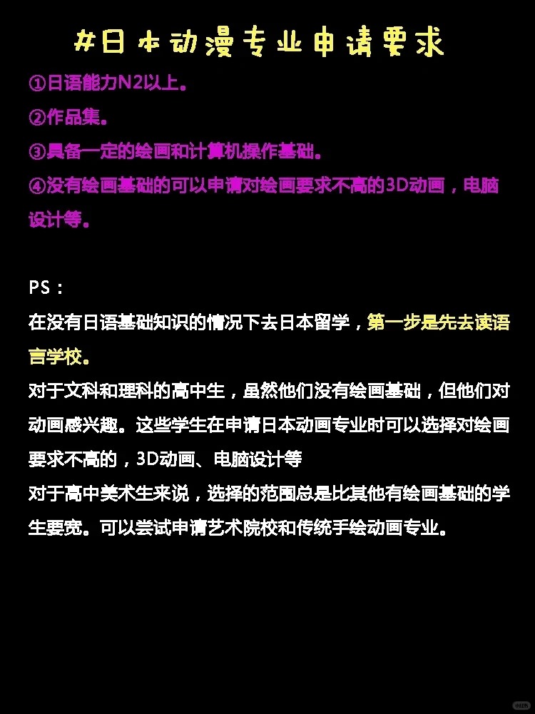 申请要求 ①日语能力N2以上。 ②作品集。 ③具备一定的绘画和计算机操作基础。 ④没有绘画基础的可以申请对绘画要求不高的3D动画,电脑设计等。