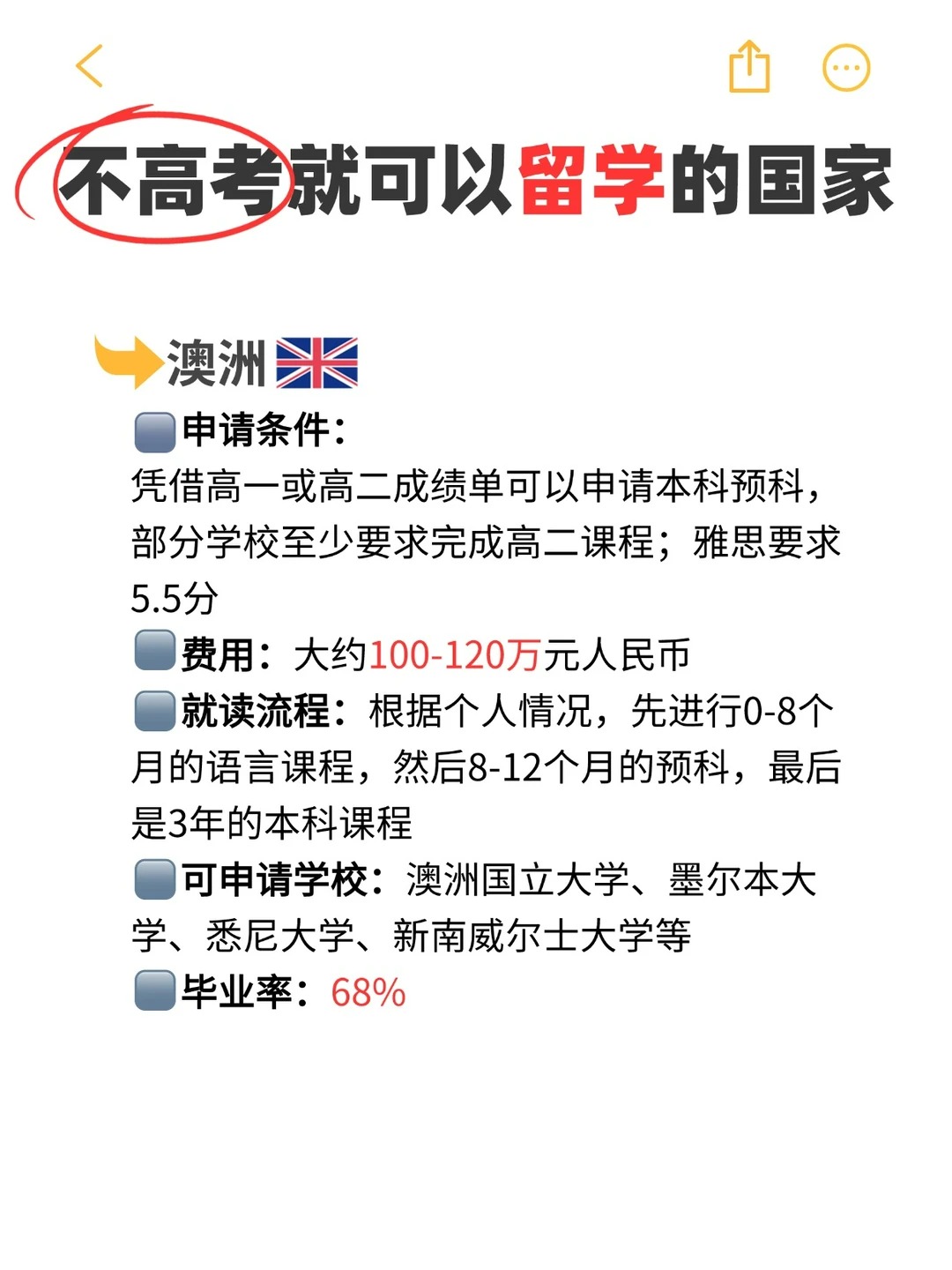 3、澳洲:阳光沙滩与你相伴!申请条件:凭借高一或高二成绩单可以申请本科预科,部分学校至少要求完成高二课程;雅思要求5.5分。费用:大约100-120万元人民币。就读流程:根据个人情况,先进行0-8个月的语言课程,然后8-12个月的预科,最后是3年的本科课程。