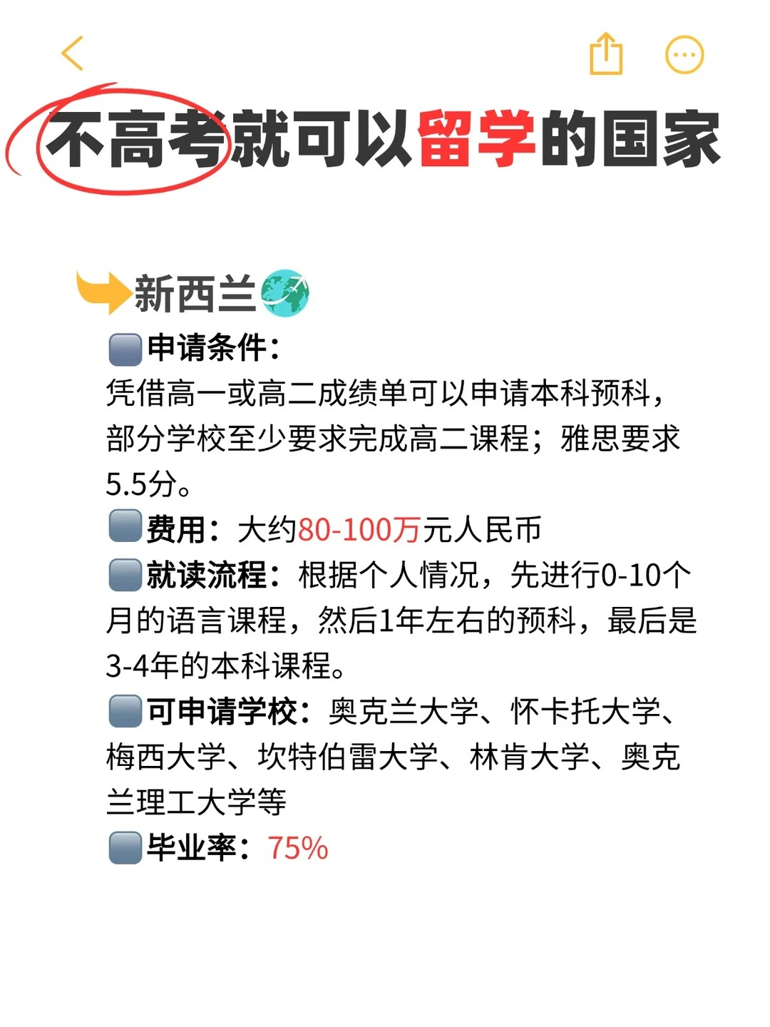 4、新西兰:纯净自然的呼唤!申请条件:凭借高一或高二成绩单可以申请本科预科,部分学校至少要求完成高二课程;雅思要求5.5分。费用:大约80-100万元人民币。就读流程:根据个人情况,先进行0-10个月的语言课程,然后1年左右的预科,最后是3-4年的本科课程。