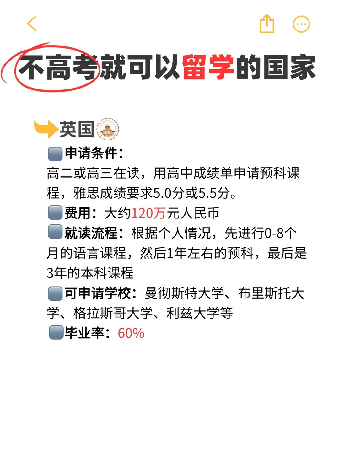 2、英国:古老学府的召唤! 申请条件:高二或高三在读,用高中成绩单申请预科课程,雅思成绩要求5.0分或5.5分。费用:大约120万元人民币。就读流程:根据个人情况,先进行0-8个月的语言课程,然后1年左右的预科,最后是3年的本科课程。