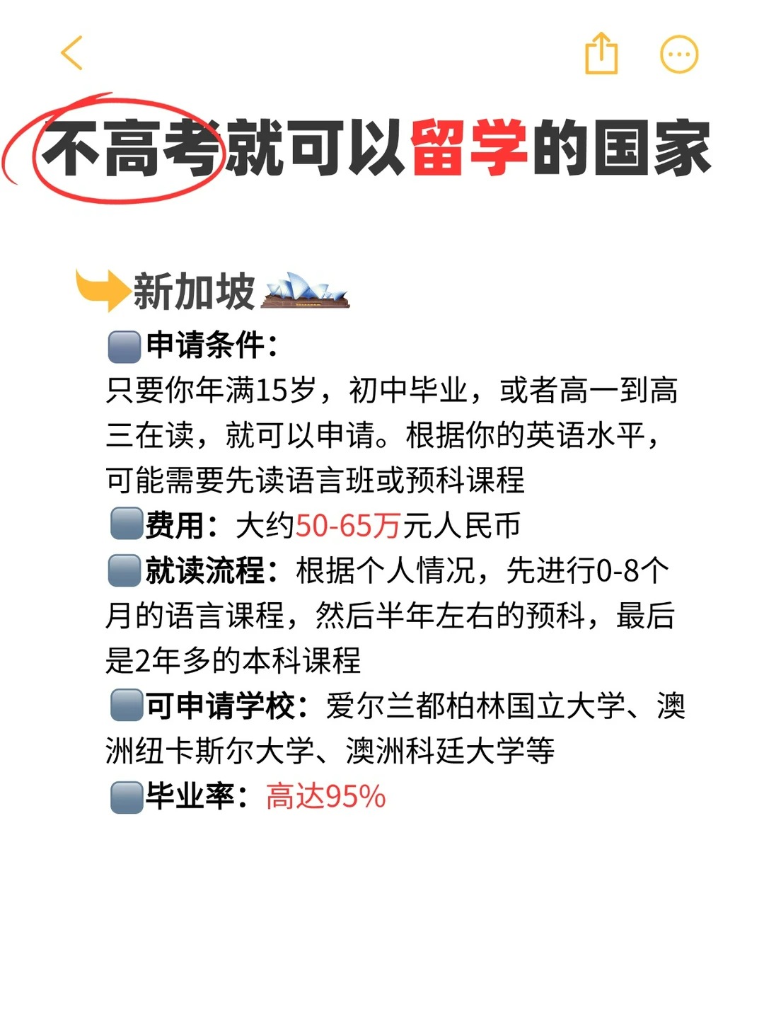 1、新加坡:亚洲的小狮子城欢迎你!申请条件:只要你年满15岁,初中毕业,或者高一到高三在读,就可以申请。根据你的英语水平,可能需要先读语言班或预科课程。费用:大约50-65万元人民币。 就读流程:根据个人情况,先进行0-8个月的语言课程,然后半年左右的预科,最后是2年多的本科课程。