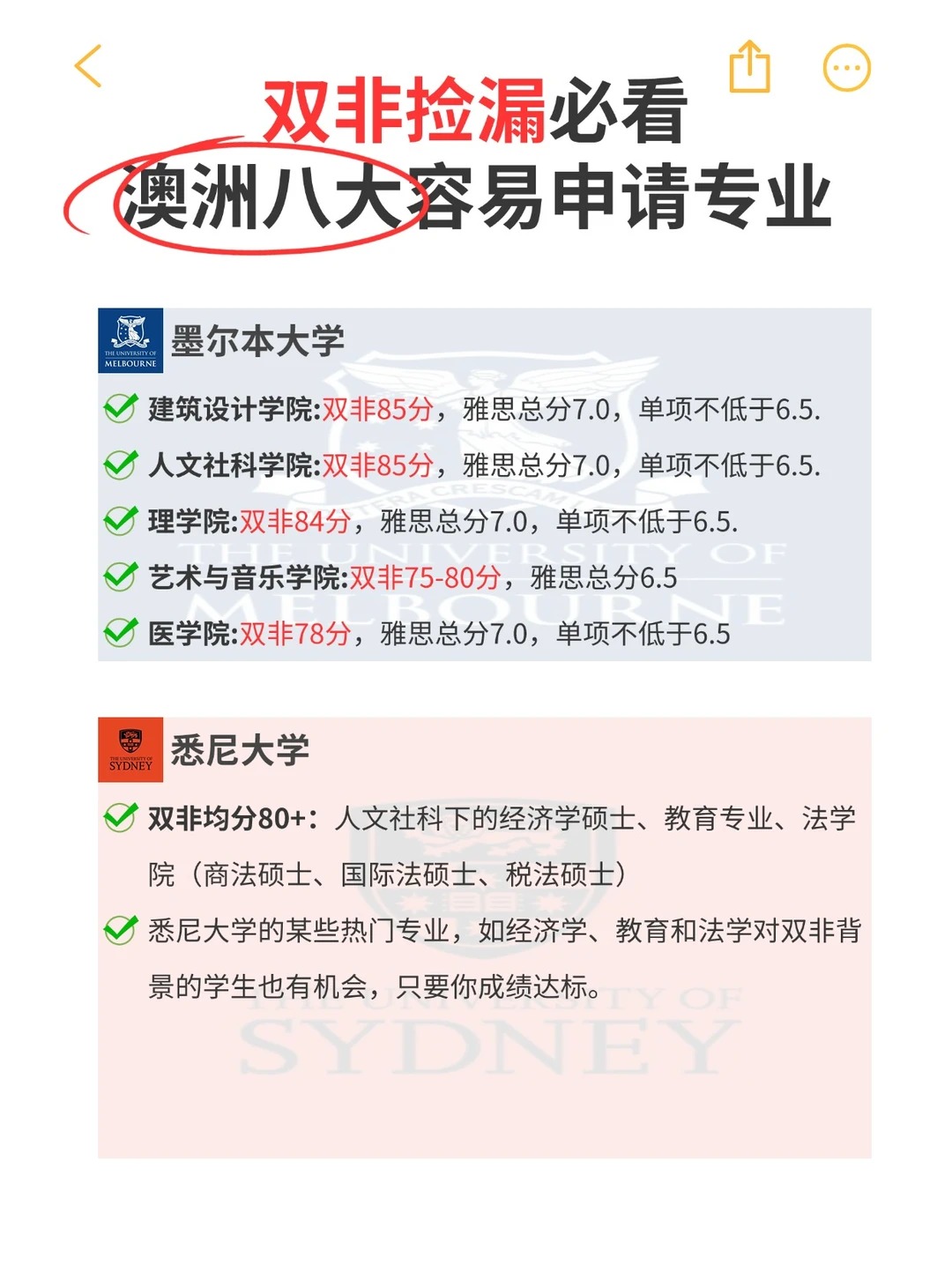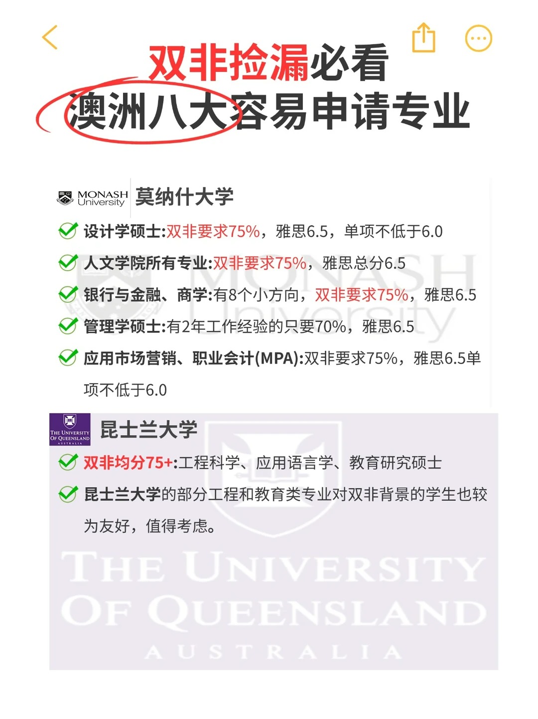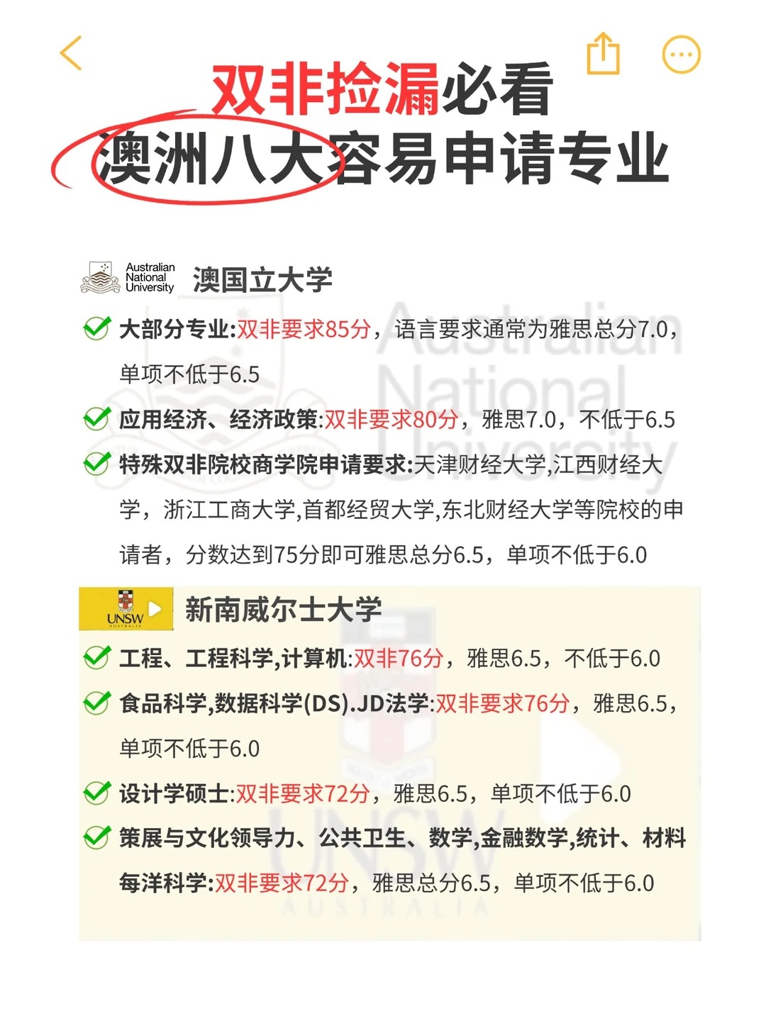 2、新南威尔士大学 (UNSW) 工程、工程科学、计算机:双非要求76分,语言要求通常为雅思总分6.5,单项不低于6.0。食品科学、数据科学 (DS)、JD法学:双非要求76分,语言要求通常为雅思总分6.5,单项不低于6.0。设计学硕士、模拟与沉浸式技术硕士:双非要求72分,语言要求通常为雅思总分6.5,单项不低于6.0。策展与文化领导力、公共卫生、数学、金融数学、统计、材料、海洋科学:双非要求72分,语言要求通常为雅思总分6.5,单项不低于6.0。