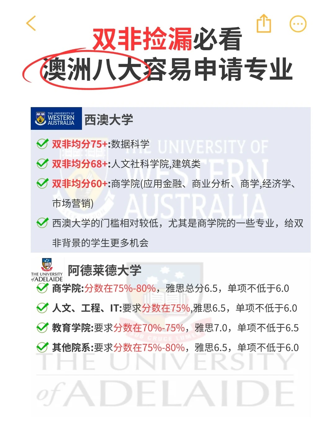 1、阿德莱德大学 (University of Adelaide) 商学院:要求分数在75%-80%之间,语言要求通常为雅思总分6.5,单项不低于6.0。人文、工程、IT:要求分数在75%,语言要求通常为雅思总分6.5,单项不低于6.0。教育学院:要求分数在70%-75%,语言要求通常为雅思总分7.0,单项不低于6.5。其他院系:要求分数在75%-80%,语言要求通常为雅思总分6.5,单项不低于6.0。