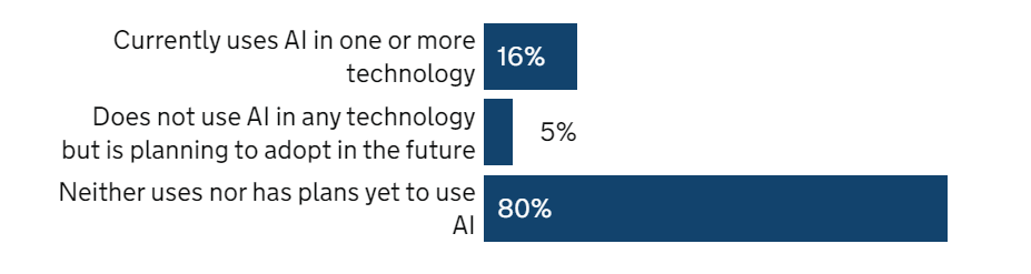 英国政府数据显示,16%的企业已规模化使用AI,大型企业优先把AI嵌入数据分析、内容生产、客户服务、流程自动化。