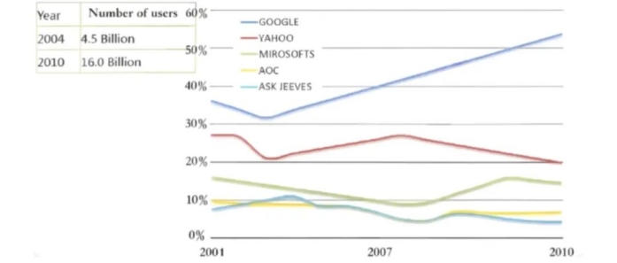 摘要:在雅思小作文中,表格+线图的混合图表题是很多考生的“拦路虎”——信息多、数据杂,一不小心就容易写成流水账。今天这篇范文带你拆解一道经典真题:2004至2010年间,搜索引擎用户数量与市场份额如何变化?我们将重点展示如何写出清晰有力的概述段,如何按逻辑分组数据,以及如何用精 准的语言描述“上升、下降、波动、持平”等趋势。如果你正在为小作文“概括不到位、对比不清晰”而苦恼,这篇解析就是为你准备的——从读图到落笔,每一步都讲透。