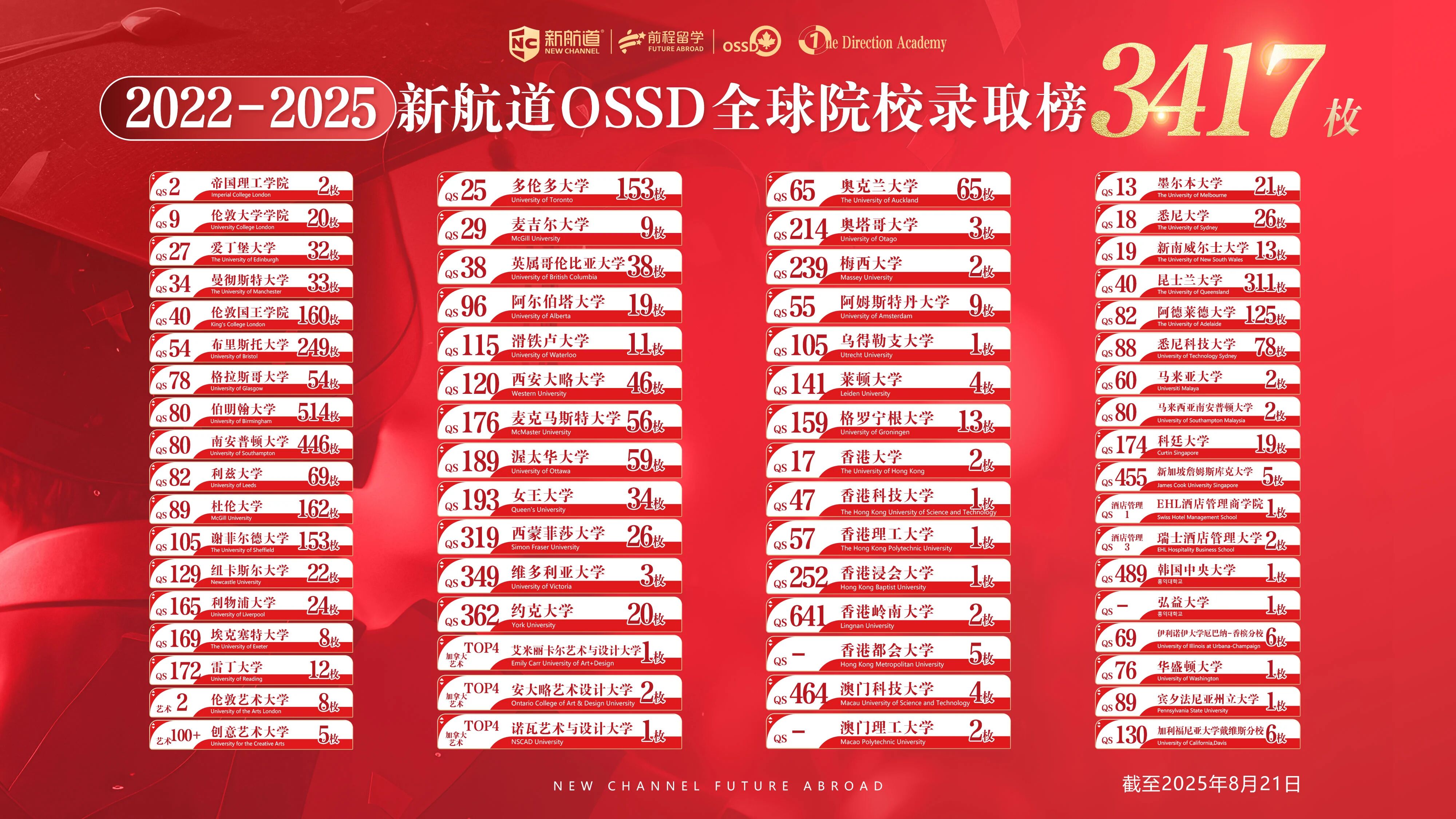 总的来说,OSSD为那些在传统高考或国际课程中感到“被定义”“被标签化”的学生,提供了一条全新的升学赛道。它不以单次考试论英雄,而是通过过程性评估、灵活的学分转化、丰富的选课自由以及纯正的外教授课,真正关注学生的真实能力与长期成长。截至目前,新航道OSSD项目已斩获3417封全球名 校Offer。如果你也想摆脱焦虑、科学冲刺世界顶 尖大学,OSSD或许就是你一直在寻找的那个拐点。