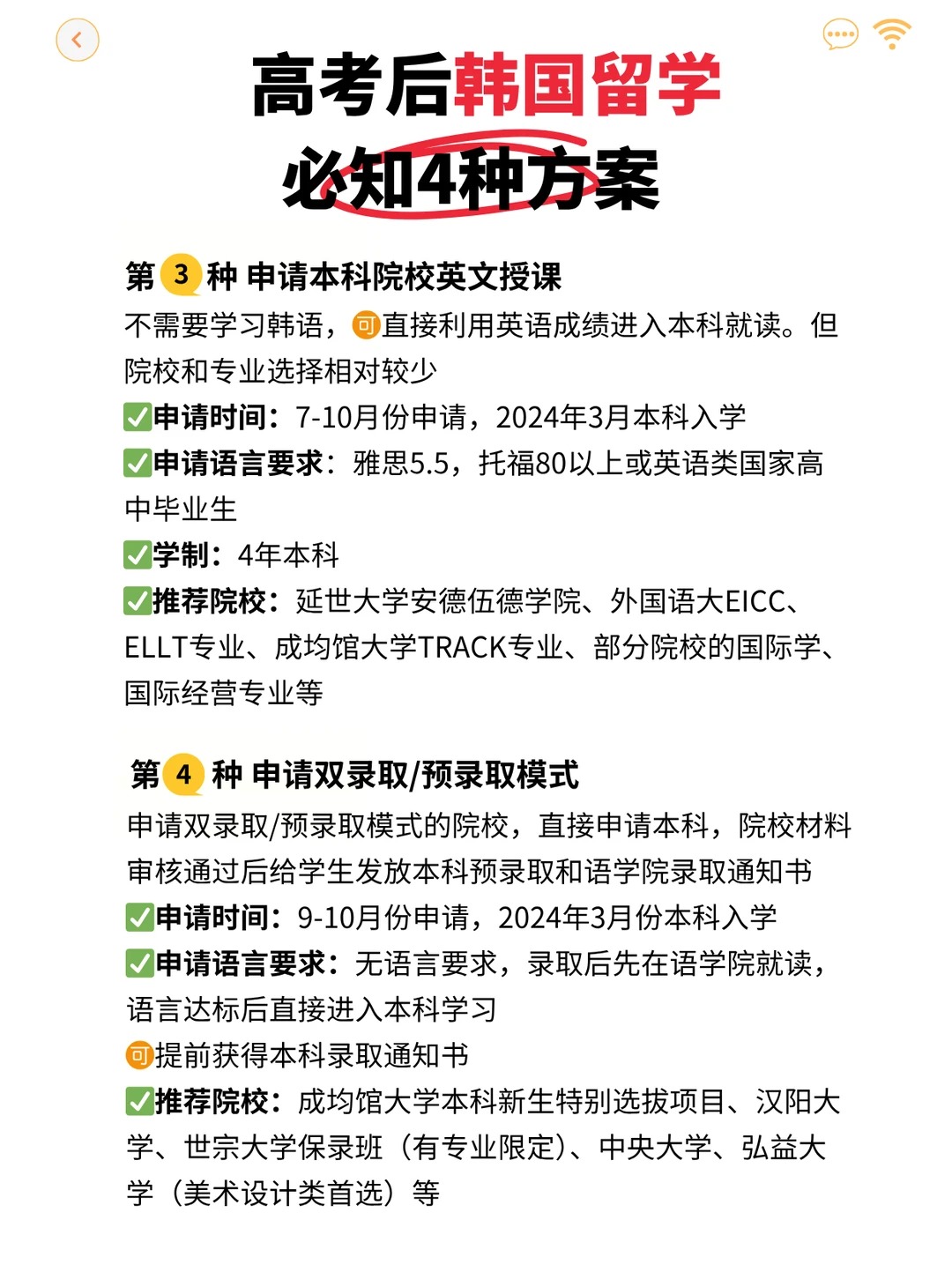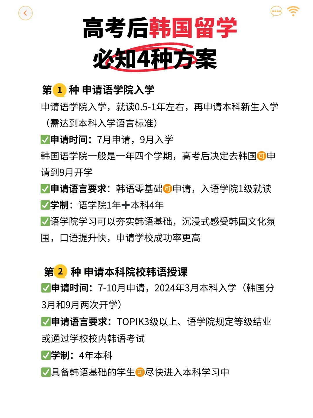 方案2:直接申请本科院校韩语授课 ;申请时间:7-10月申请,2024年3月本科入学(韩国分3月和9月两次开学) ;申请语言要求:TOPIK3级以上、语学院规定等级结业或通过学校校内韩语考试 ;学制:4年本科 。