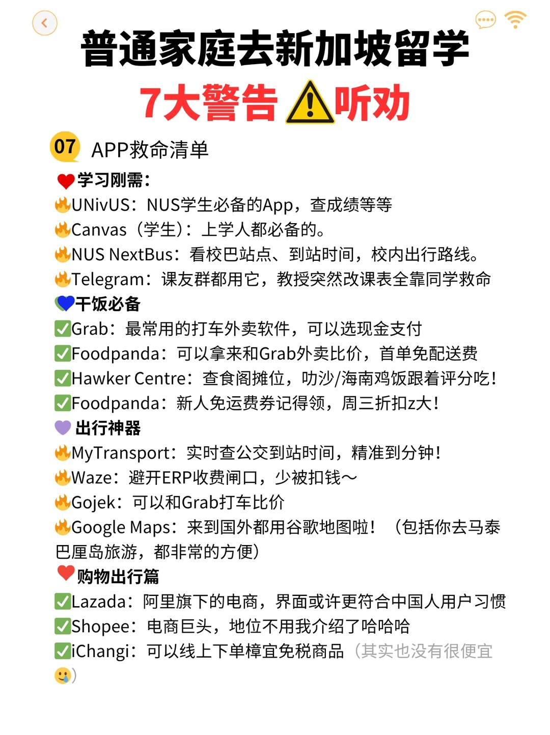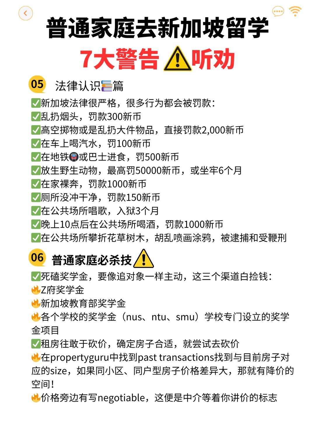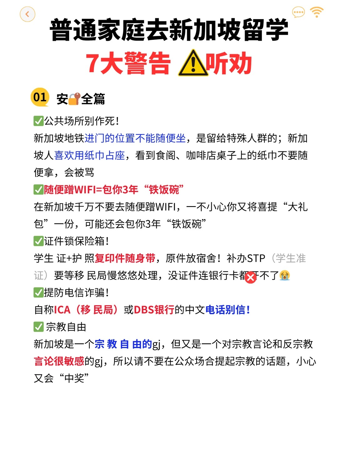 安全篇: 公共场所别作死! 新加坡地铁进门的位置不能随便坐,是留给特殊人群的;新加坡人喜欢用纸巾占座,看到食阁、咖啡店桌子上的纸巾不要随便拿,会被骂 。随便蹭WIFI=包你3年“铁饭碗” 在新加坡千万不要去随便蹭WIFI,一不小心你又将喜提“大礼包”一份,可能还会包你3年“铁饭碗” 。证件锁保险箱! 学生 证+护 照复印件随身带,原件放宿舍!补办STP(学生准证)要等移 民局慢悠悠处理,没证件连银行卡都开不了。提防电信诈骗! 自称ICA(移 民局)或DBS银行的中文电话别信!坡坡官 方机构一般用英文沟通,直接挂断+报警! 新加坡是一个宗 教 自 由的gj,但又是一个对宗教言论和反宗教言论很敏感的gj,所以请不要在公众场合提起宗教的话题,小心又会“中奖”。