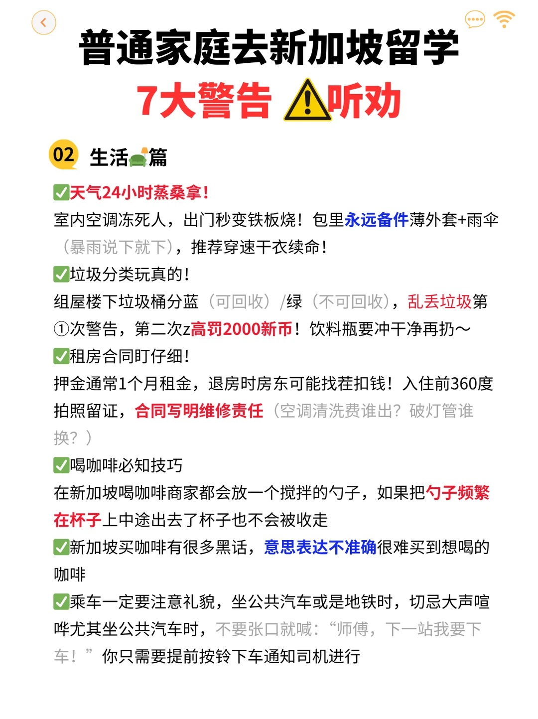 生活篇: 喝咖啡必知技巧 在新加坡喝咖啡商家都会放一个搅拌的勺子,如果把勺子频繁在杯子上中途出去了杯子也不会被收走 。天气24小时蒸桑拿! 室内空调冻死人,出门秒变铁板烧!包里永远备件薄外套+雨伞(暴雨说下就下),推荐穿速干衣续命! 垃圾分类玩真的! 组屋楼下垃圾桶分蓝(可回收)/绿(不可回收),乱丢垃圾第①次警告,第二次z高罚2000新币!饮料瓶要冲干净再扔~ 租房合同盯仔细! 押金通常1个月租金,退房时房东可能找茬扣钱!入住前360度拍照留证,合同写明维修责任(空调清洗费谁出?破灯管谁换?)