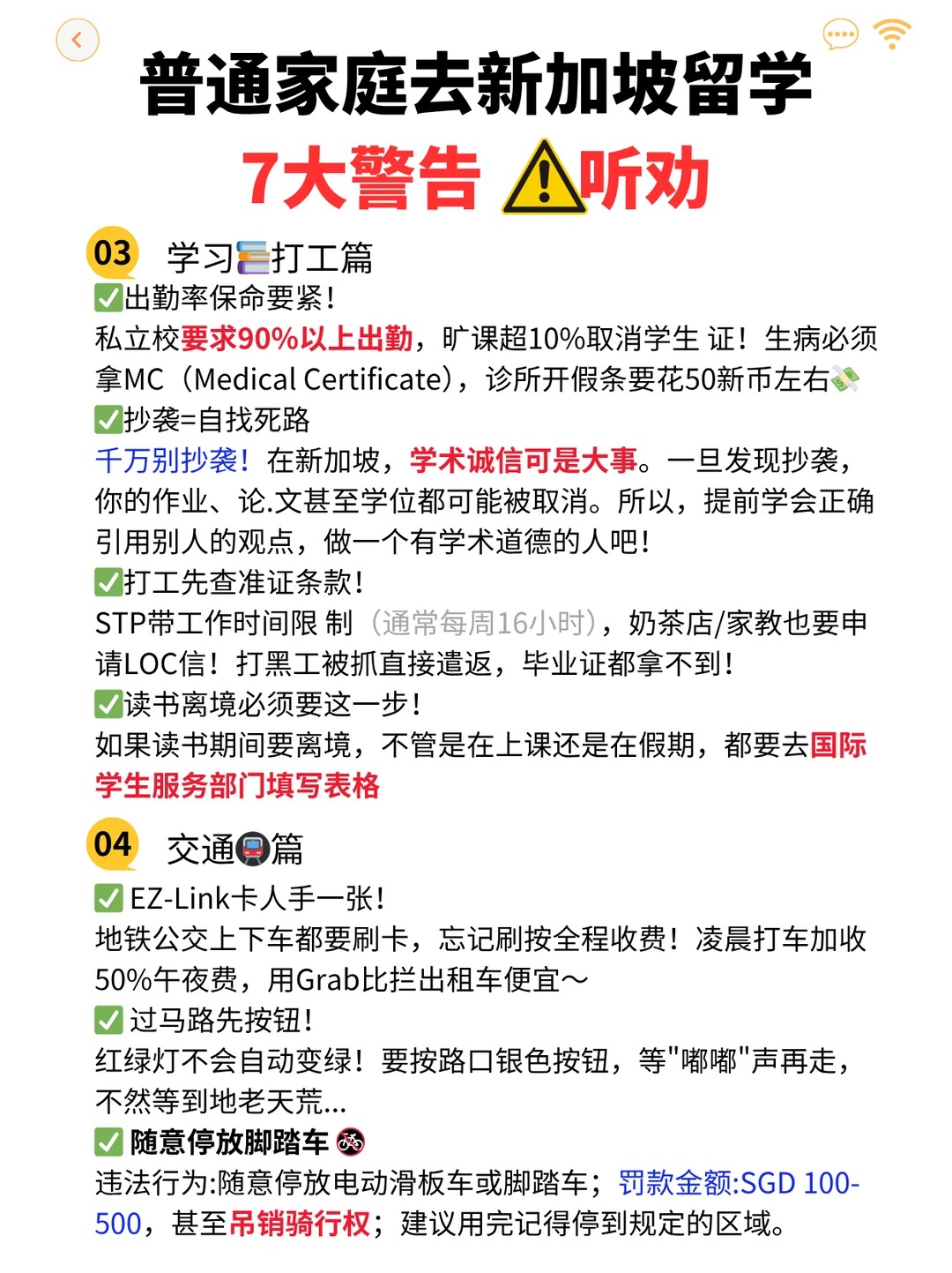 学习&打工篇: 出勤率保命要紧! 私立校要求90%以上出勤,旷课超10%直接取消学生 证!生病必须拿MC(Medical Certificate),诊所开假条要花50新币左右。抄袭=自找死路 千万别抄袭!在新加坡,学术诚信可是大事。一旦发现抄袭,你的作业、论.文甚至学位都可能被取消。所以,提前学会正确引用别人的观点,做一个有学术道德的人吧! 打工先查准证条款! STP带工作时间限 制(通常每周16小时),奶茶店/家教也要申请LOC信!打黑工被抓直接遣返,毕业证都拿不到!
