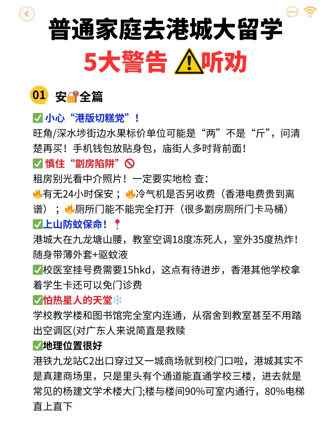 慎住“劏房陷阱”! 租房别光看中介照片!一定要实地检 查: 有无24小时保安&冷气机是否另收费(香港电费贵到离谱)&厕所门能不能完全打开(很多劏房厕所门卡马桶) 。