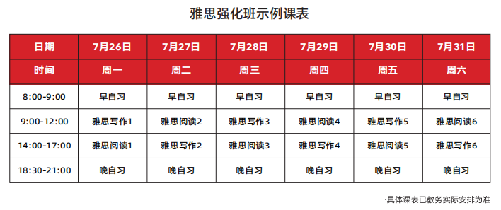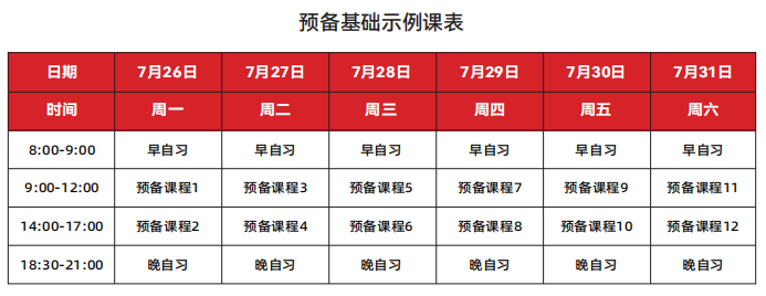 暑假封闭班除每天4-6个小时的正课之外,安排了早自习1个小时、晚自习1-2个小时,辅导课1-3个小时,一天10个小时左右的学习时间,从早到晚,安排满满,课时量更大,学习时间更长,训练更多,效果更好。