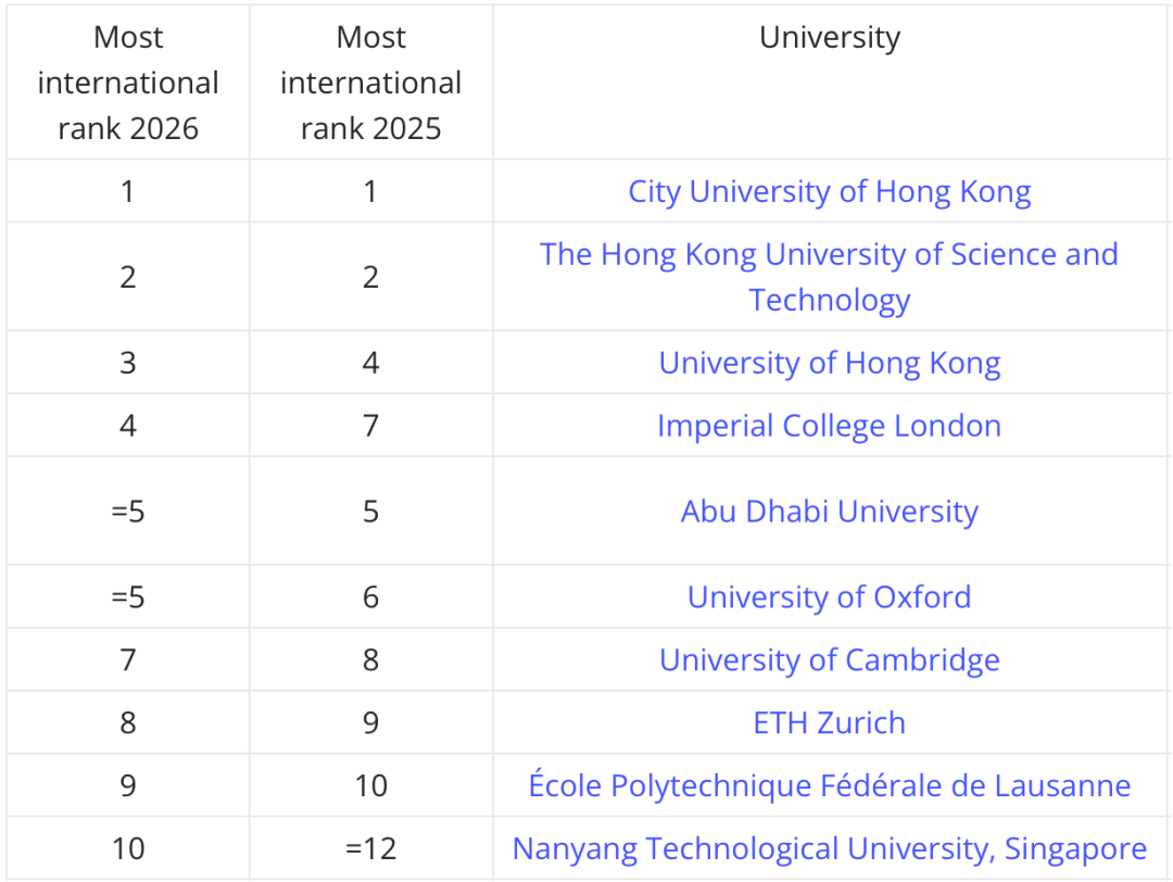 近日,泰晤士高等教育(THE)正式发布2026年全球国际化大学排名,从国际学术人员、国际学生、国际合著及国际声誉四个维度,衡量全球高校的“全球化”真实水平。今年共有来自42个国家/地区的217所院校上榜,中国香港高校延续霸主表现,包揽全球前三,其中香港城市大学连续七年稳居榜首。英国帝国理工学院、牛津大学、剑桥大学全部跻身TOP10,美国麻省理工、哈佛等顶 尖名 校也悉数在列。这份榜单为留学生选校提供了一个关键视角:你将与谁为伍,你的国际视野将在怎样的土壤中生长?
