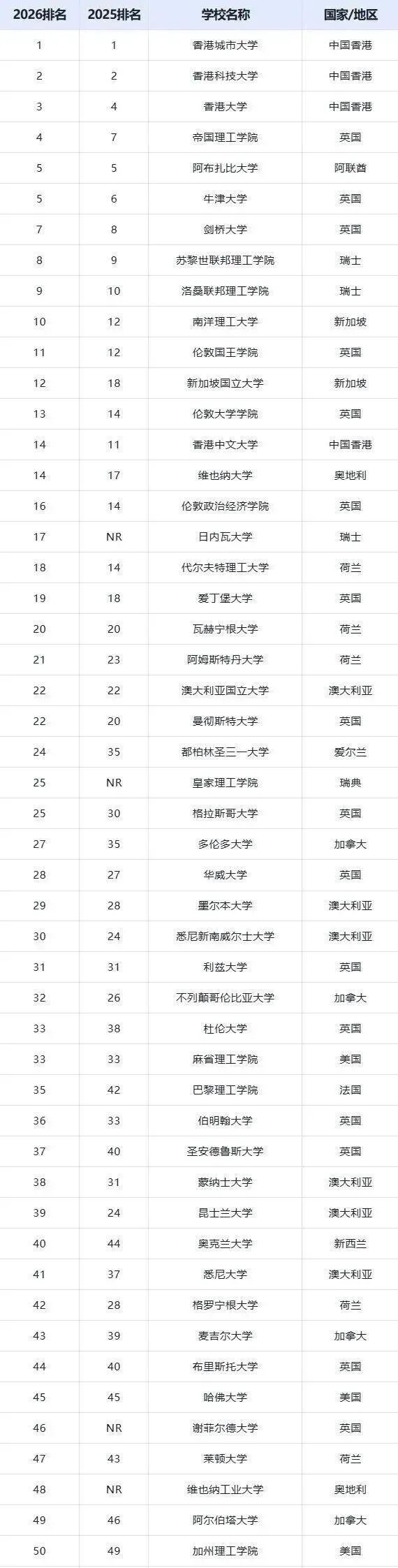 阿联酋的阿布扎比大学并列第五。瑞士的苏黎世联邦理工学院和洛桑联邦理工学院都比去年上升一名,分别位列第八和第九。新加坡南洋理工大学较去年上升2名,位列第10名。
