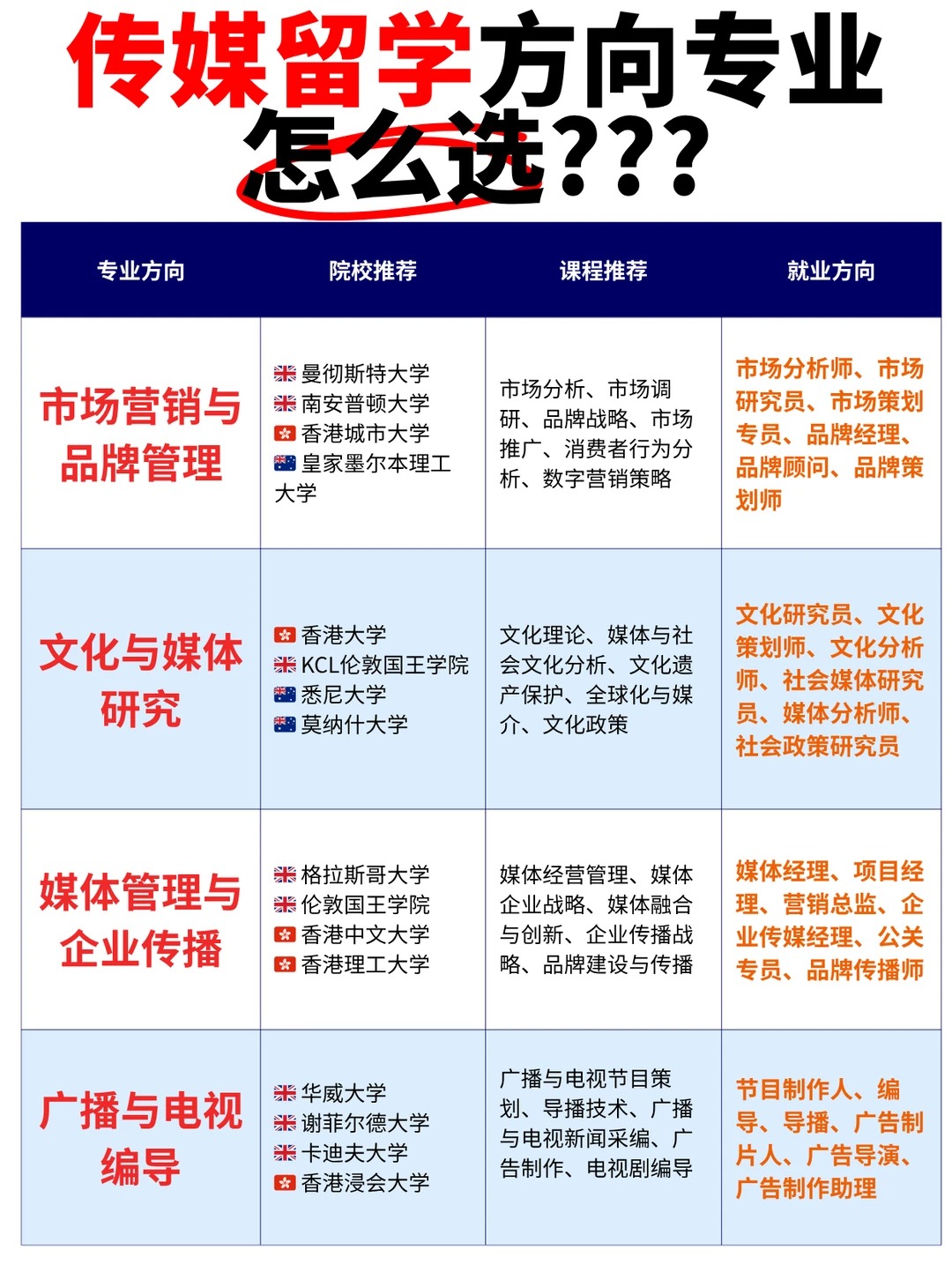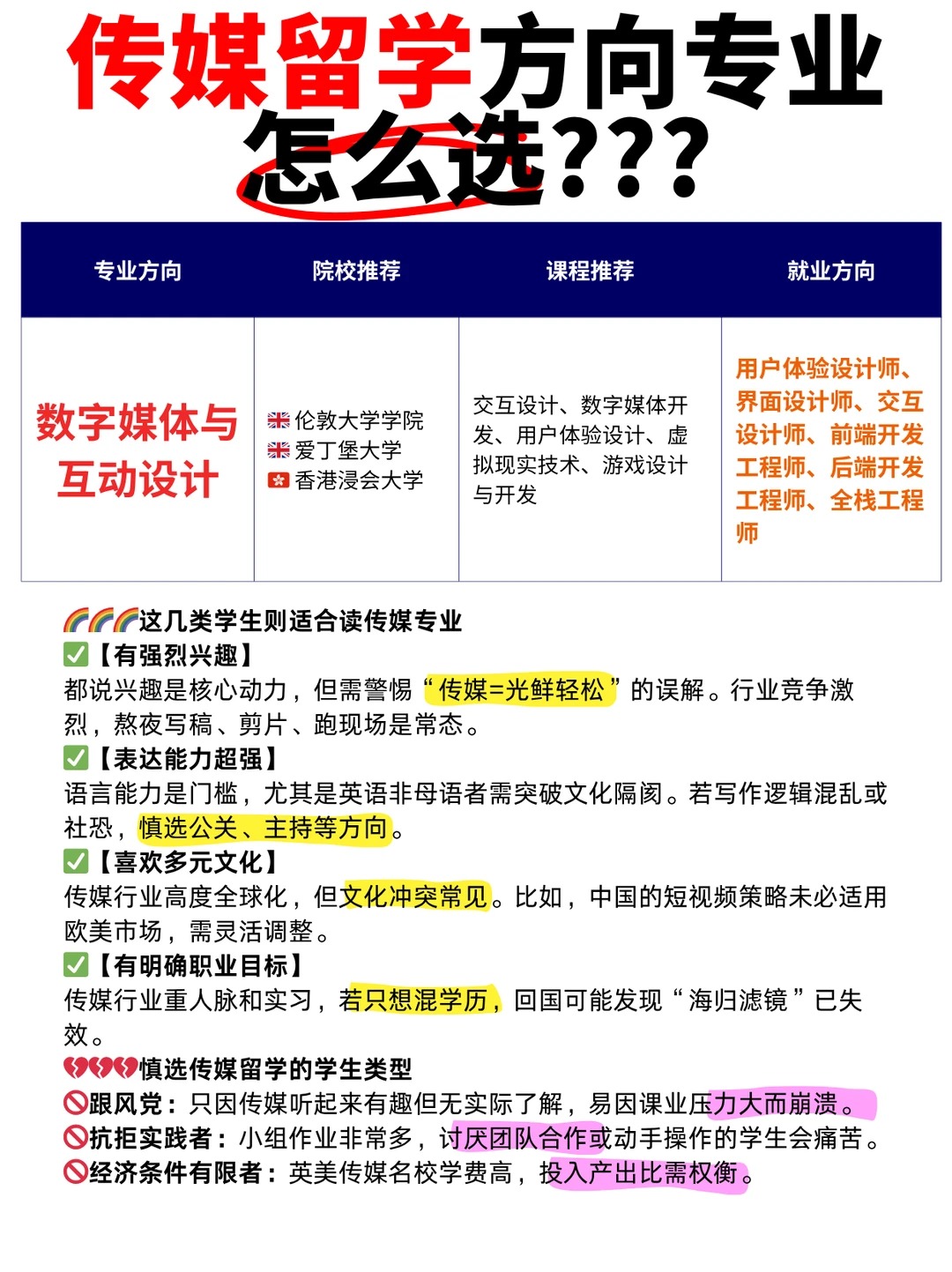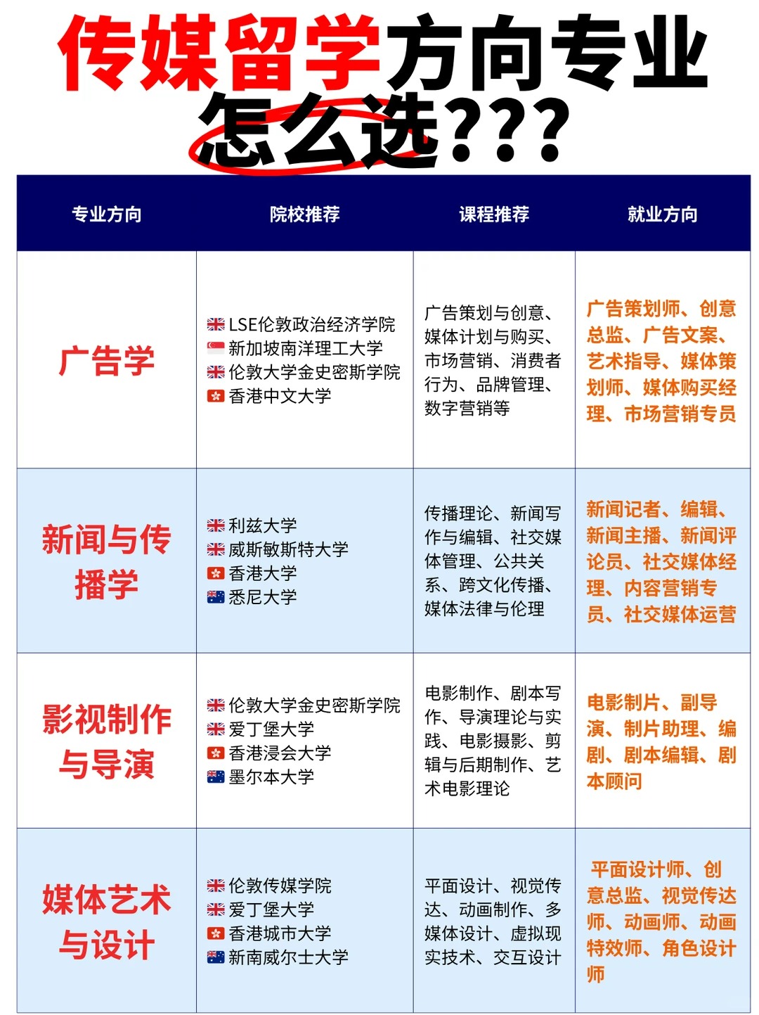 【有明确职业目标】 适合方向:针对性选择专业(如广告学、调查新闻学),优先选地理位置好、校友网络强的院校(如纽约、伦敦)。 传媒行业重人脉和实XI,若只想混学历,回国可能发现“海归滤镜”已失效。