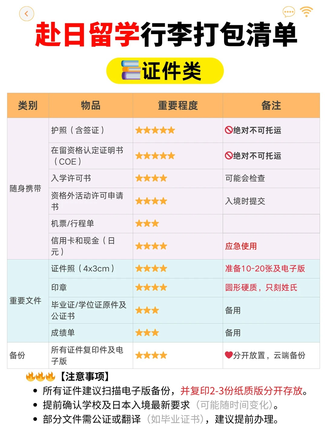 【文件与证明材料】建议原件+多份复印件/扫描电子版 这些文件用于办理在日本的后续手续,如办理入住、在留卡、国民健康保险等。 照片:4cm x 3cm(白底无帽正面照),10-20张,用于交通卡、国民健康保险、打工申请等。 务必在手机和U盘里保存一份电子版 。各种公证书(建议带2-3份复印件):毕业证、学位证的公证书 、成绩单( 学校开具的、带有公章的中英文或中日文对照成绩单)、国际驾驶许可证 (可选) 。印章(判子):直径8-12mm的圆形硬质印章(如牛角、象牙材质),只刻姓氏即可(如“田中”、“李”) PS:千万不要用橡皮章那种软的,bank等机构不承认。 xinyong卡和少量现金:带一张国际xinyong卡(Visa/Mastercard/JCB),现金准备约2500-5000元即可,用于支付从机场到住所的交通费、前几天的餐食费和应急。 证件复印件及电子备份: 关键证件进行复印(至少2份),并与原件分开放置。