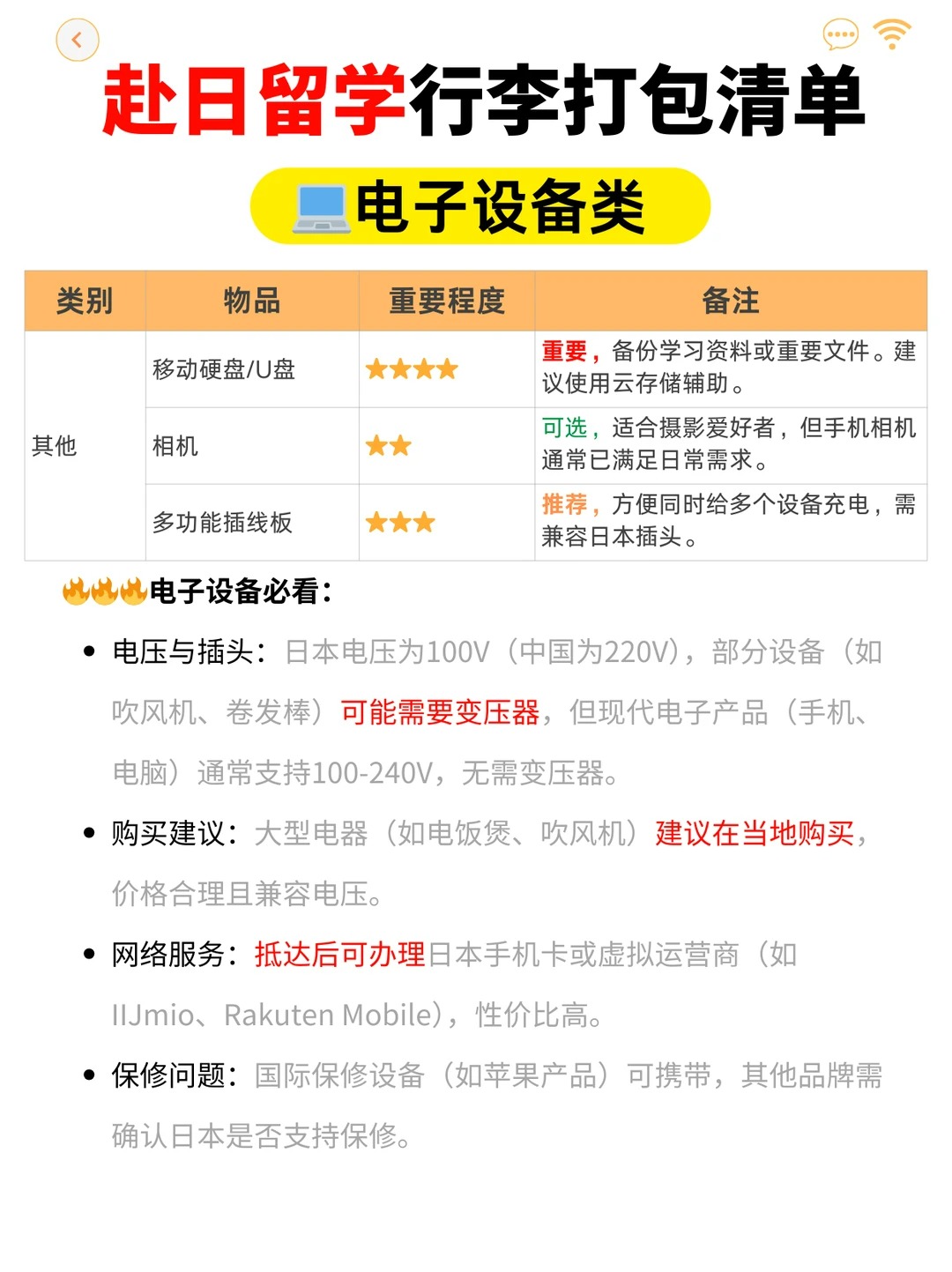 电子设备必看: 电压与插头:日本电压为100V(中国为220V),部分设备(如吹风机、卷发棒)可能需要变压器,但现代电子产品(手机、电脑)通常支持100-240V,无需变压器。 建议:大型电器(如电饭煲、吹风机)建议在当地入,价格合理且兼容电压。