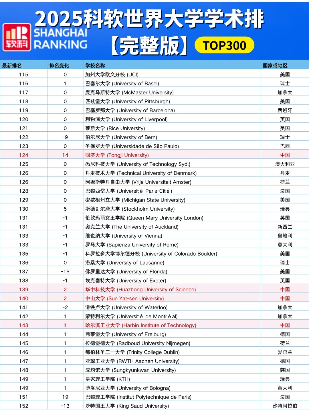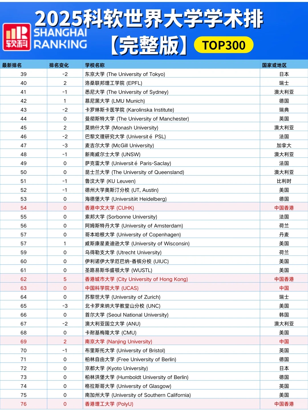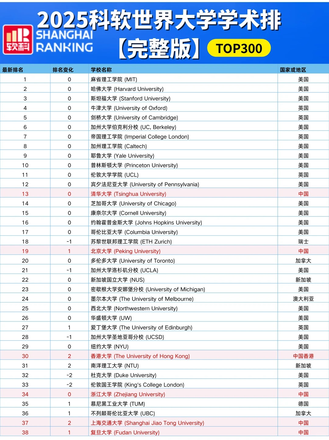 各国高校排名情况:中国高校 中国内地共有222所大学上榜,其中13所位列世界百强。清华大学跻身前二十,位列全球第18,亚洲第 一。 中国香港地区: 香港大学排名第67,上升2位! 香港城市大学冲进前百,排名第99! 香港中文大学(第101-150)、香港理工大学(第151-200)、香港科技大学(第201-300)均在前300强中。 美国高校 美国依旧8所院校跻身前10,有37所院校进入前100。 其中: 哈佛大学 、斯坦福大学 、麻省理工学院 占据前3,与去年排名保持一致。 加州大学伯克利分校、普林斯顿大学、哥伦比亚大学、芝加哥大学稳居全球第5、第7、第8和第10的位置。 加州理工学院位列第9,下调1位。 英国高校 英国共8所大学进入TOP100,有3所院校排名提升: 伦敦大学学院(提升2名) 、爱丁堡大学(提升3名) 、曼彻斯特大学(提升6名) 此外: 剑桥大学--第4 、牛津大学--第6 、伦敦大学学院--第14 、帝国理工大学--第26、爱丁堡大学--第37 、曼彻斯特大学--第46 、伦敦国王学院--第61、布里斯托尔大学--第98 。加拿大高校 加拿大地区3所高校进入TOP100榜单: 多伦多大学为首,排名第25,较去年上升1位、 英属哥伦比亚大学第53 、麦吉尔大学第76 麦克马斯特大学和阿尔伯塔大学均在第101-150之间。