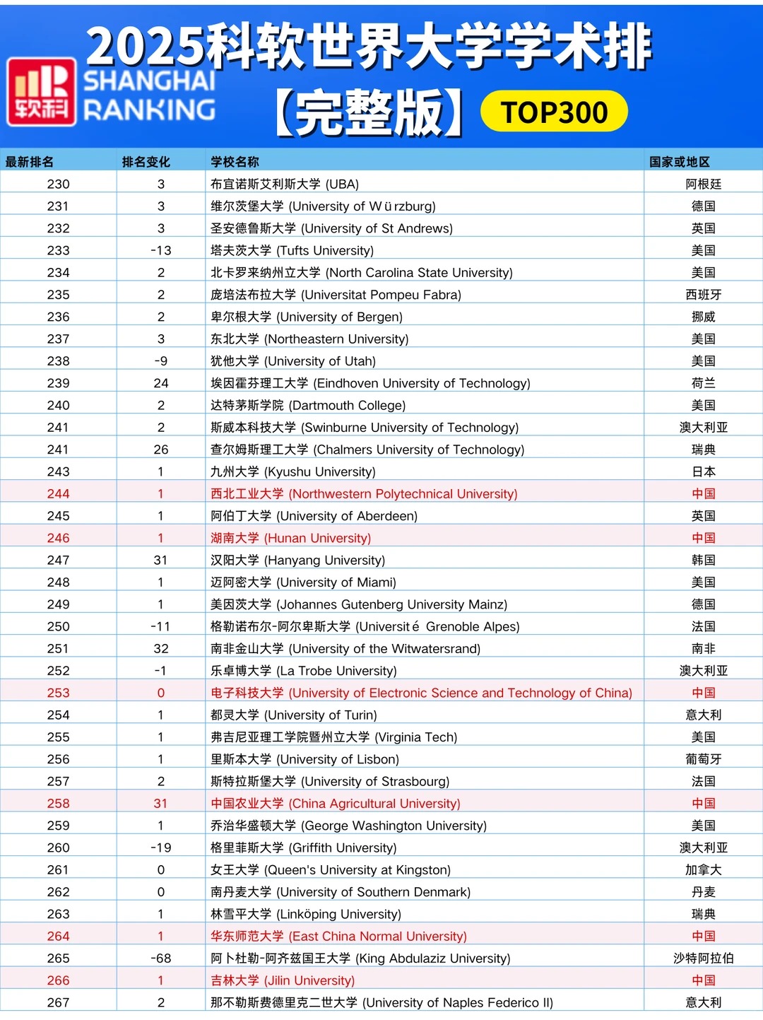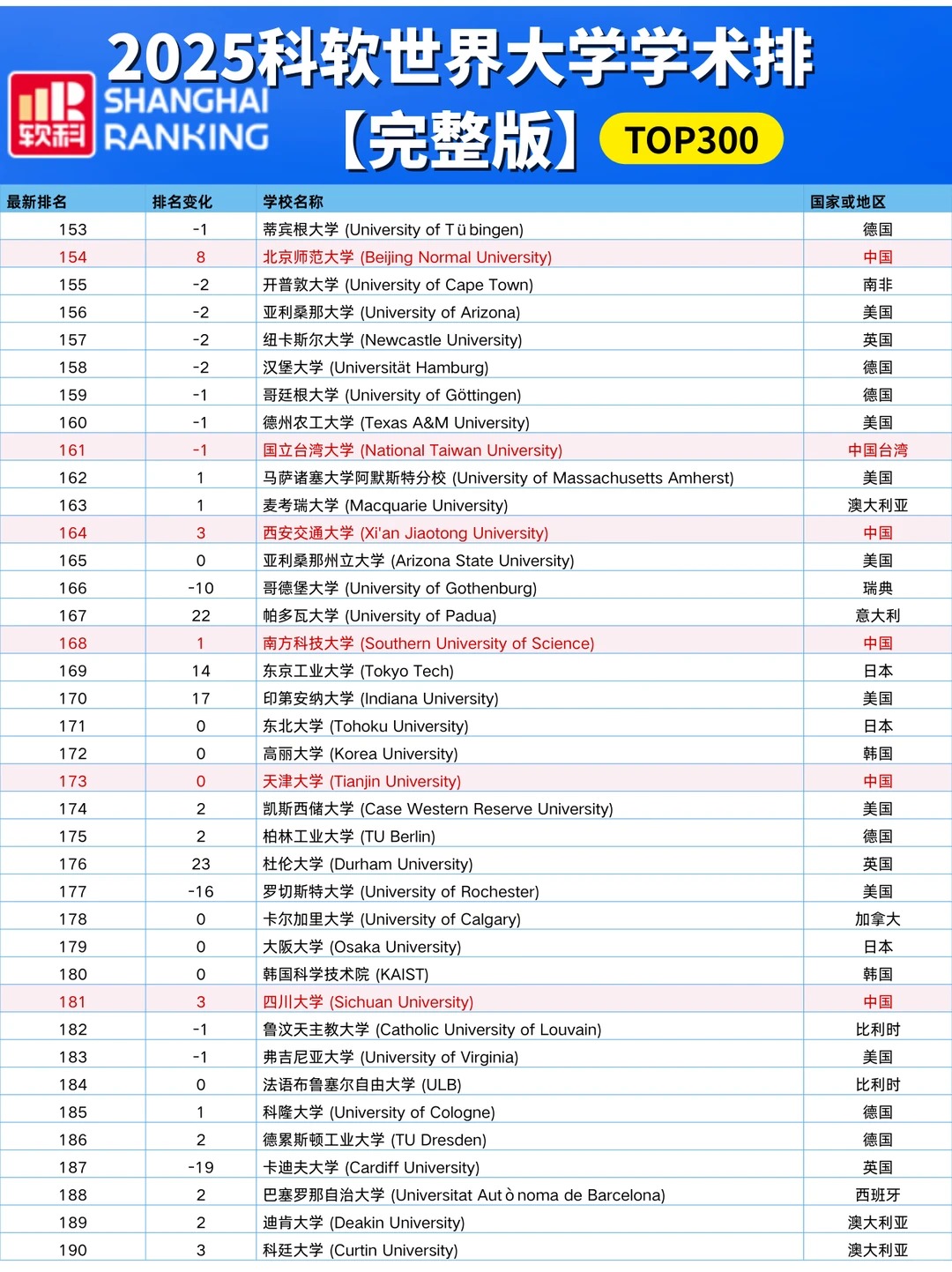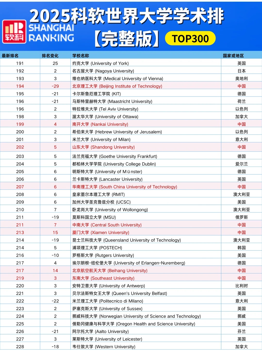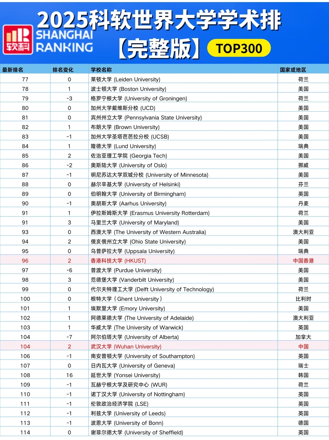 各国高校排名情况:中国高校 中国内地共有222所大学上榜,其中13所位列世界百强。清华大学跻身前二十,位列全球第18,亚洲第 一。 中国香港地区: 香港大学排名第67,上升2位! 香港城市大学冲进前百,排名第99! 香港中文大学(第101-150)、香港理工大学(第151-200)、香港科技大学(第201-300)均在前300强中。 美国高校 美国依旧8所院校跻身前10,有37所院校进入前100。 其中: 哈佛大学 、斯坦福大学 、麻省理工学院 占据前3,与去年排名保持一致。 加州大学伯克利分校、普林斯顿大学、哥伦比亚大学、芝加哥大学稳居全球第5、第7、第8和第10的位置。 加州理工学院位列第9,下调1位。 英国高校 英国共8所大学进入TOP100,有3所院校排名提升: 伦敦大学学院(提升2名) 、爱丁堡大学(提升3名) 、曼彻斯特大学(提升6名) 此外: 剑桥大学--第4 、牛津大学--第6 、伦敦大学学院--第14 、帝国理工大学--第26、爱丁堡大学--第37 、曼彻斯特大学--第46 、伦敦国王学院--第61、布里斯托尔大学--第98 。加拿大高校 加拿大地区3所高校进入TOP100榜单: 多伦多大学为首,排名第25,较去年上升1位、 英属哥伦比亚大学第53 、麦吉尔大学第76 麦克马斯特大学和阿尔伯塔大学均在第101-150之间。