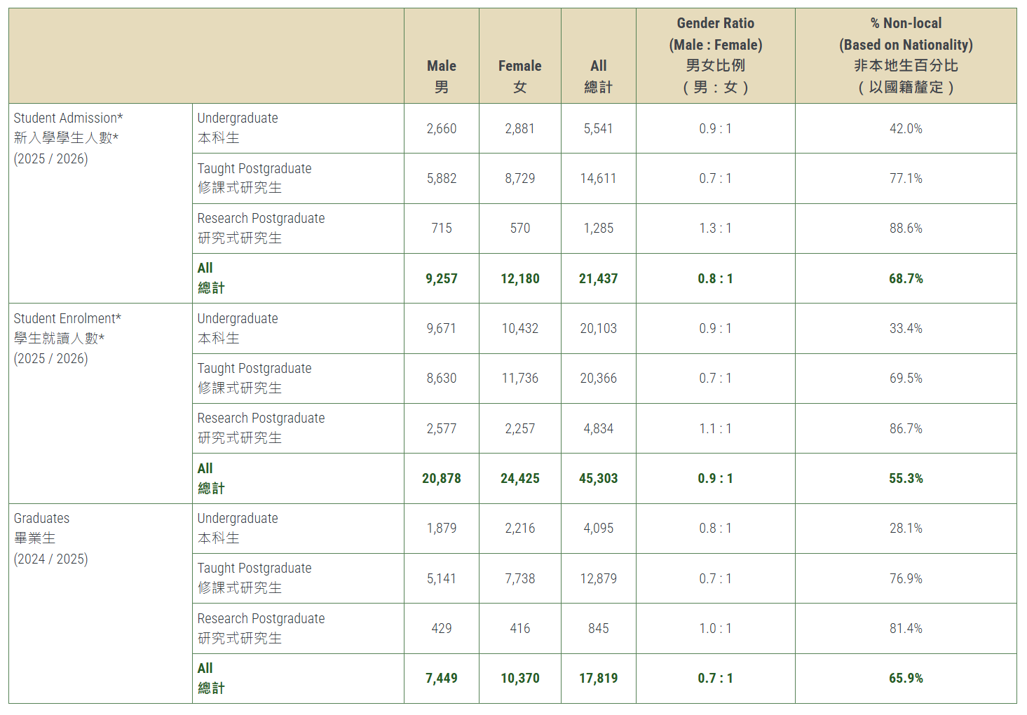 摘要:香港大学近日公布2025-26学年最 新学生数据,引发广泛关注:本科生总人数首 次突破两万,达20,103人;非本地本科生中,内地学生占比从去年的29.64%攀升至65.5%,创下近六年最 高纪录。与此同时,修课式研究生中内地生比例更是高达95.1%。这些数字清晰地表明:港大正加速 成为内地学子眼中的“顶流梦校”。