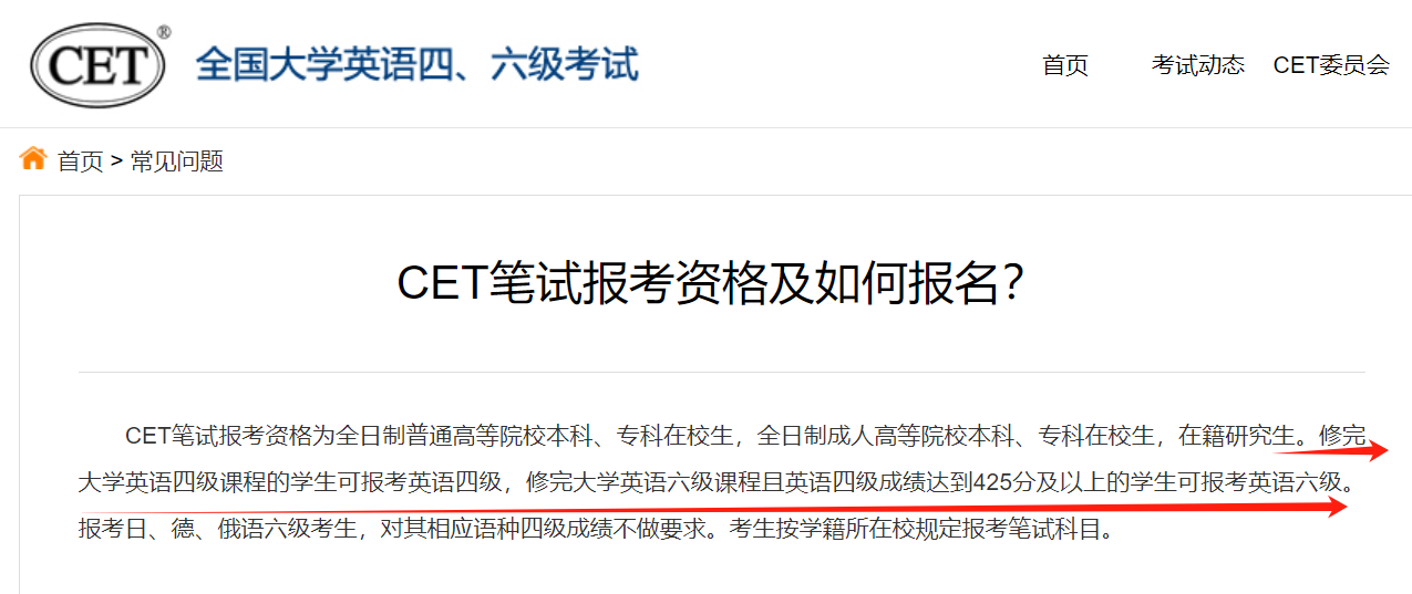 四六级的官方报考资格明确指出:一般修完大学英语四级课程的学生才能报考CET4