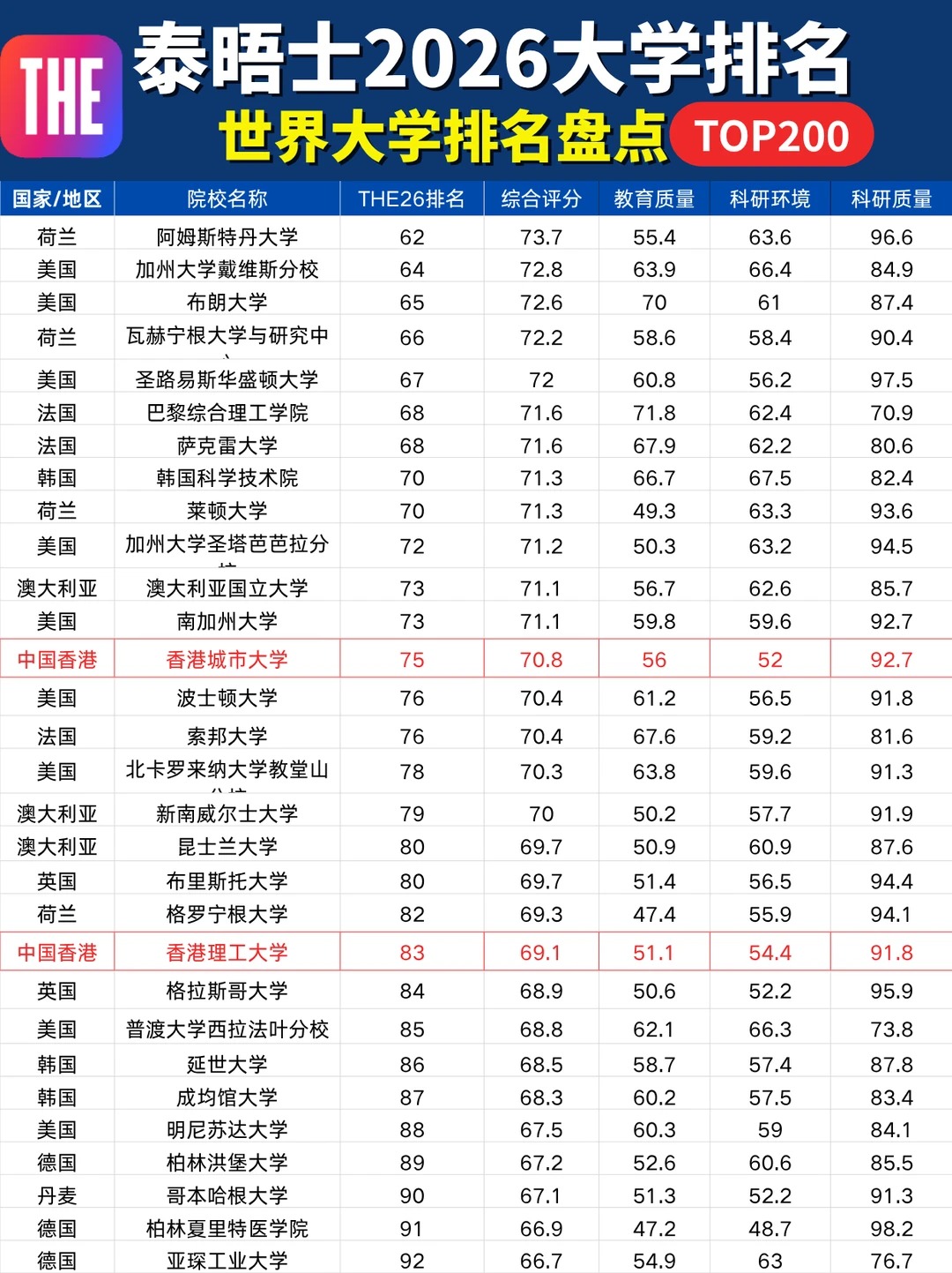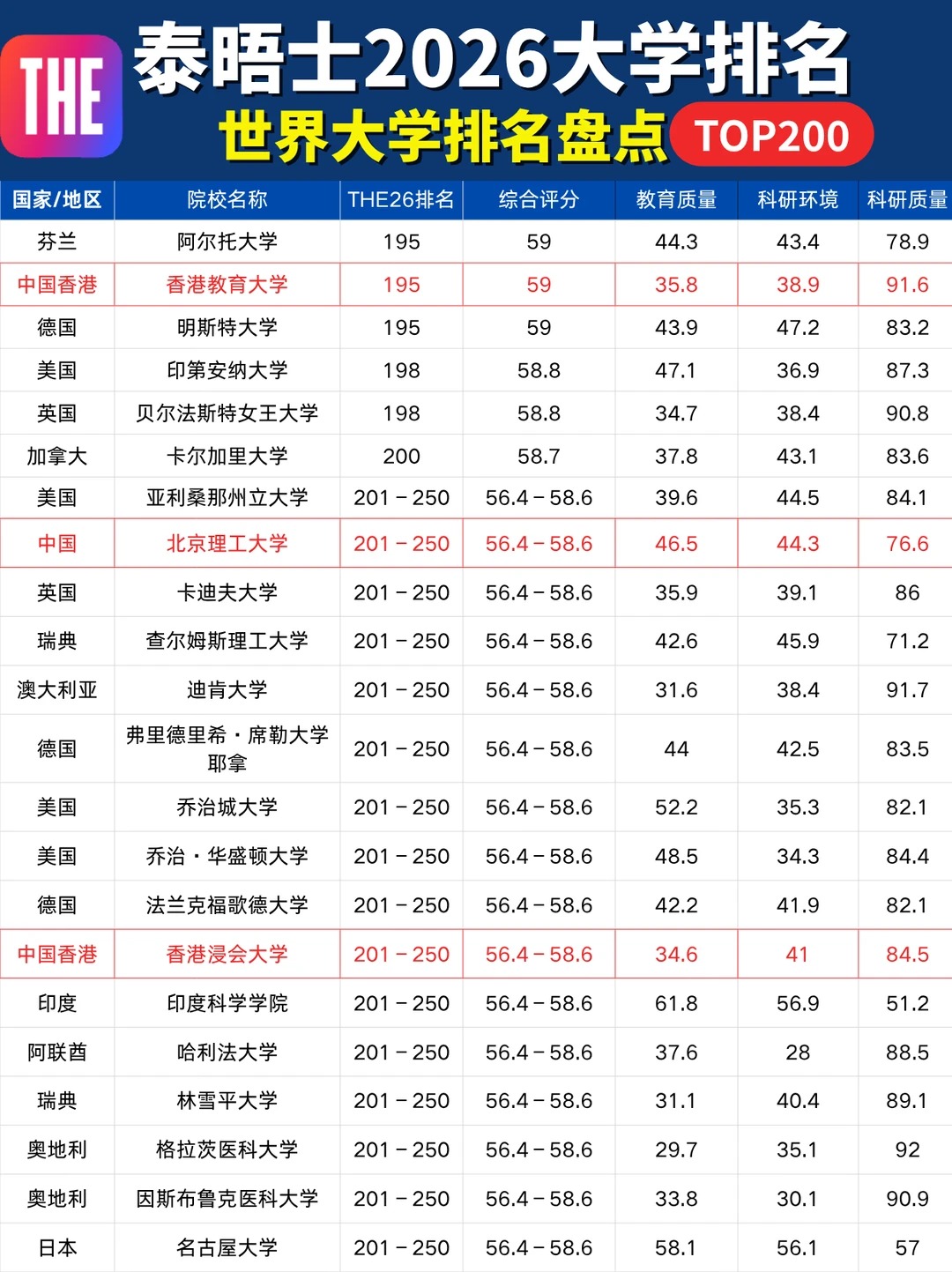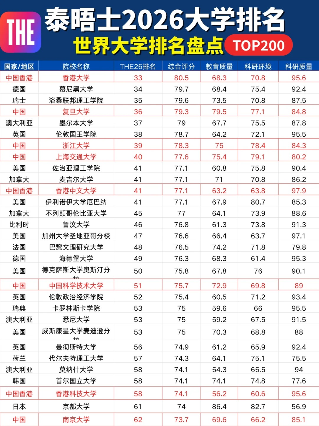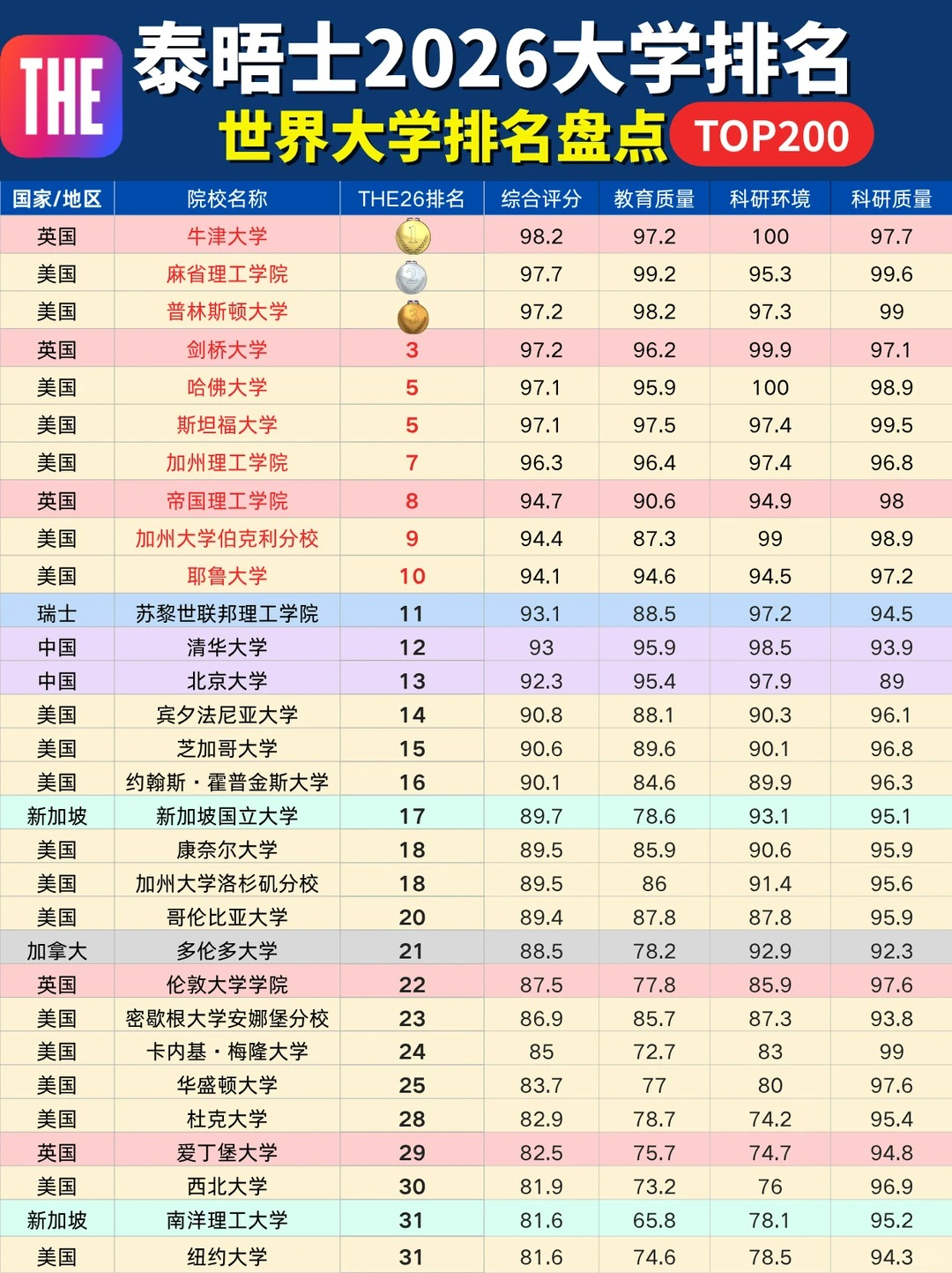 10月9日泰晤士高等教育(THE)更新了2026年世界大学排名!