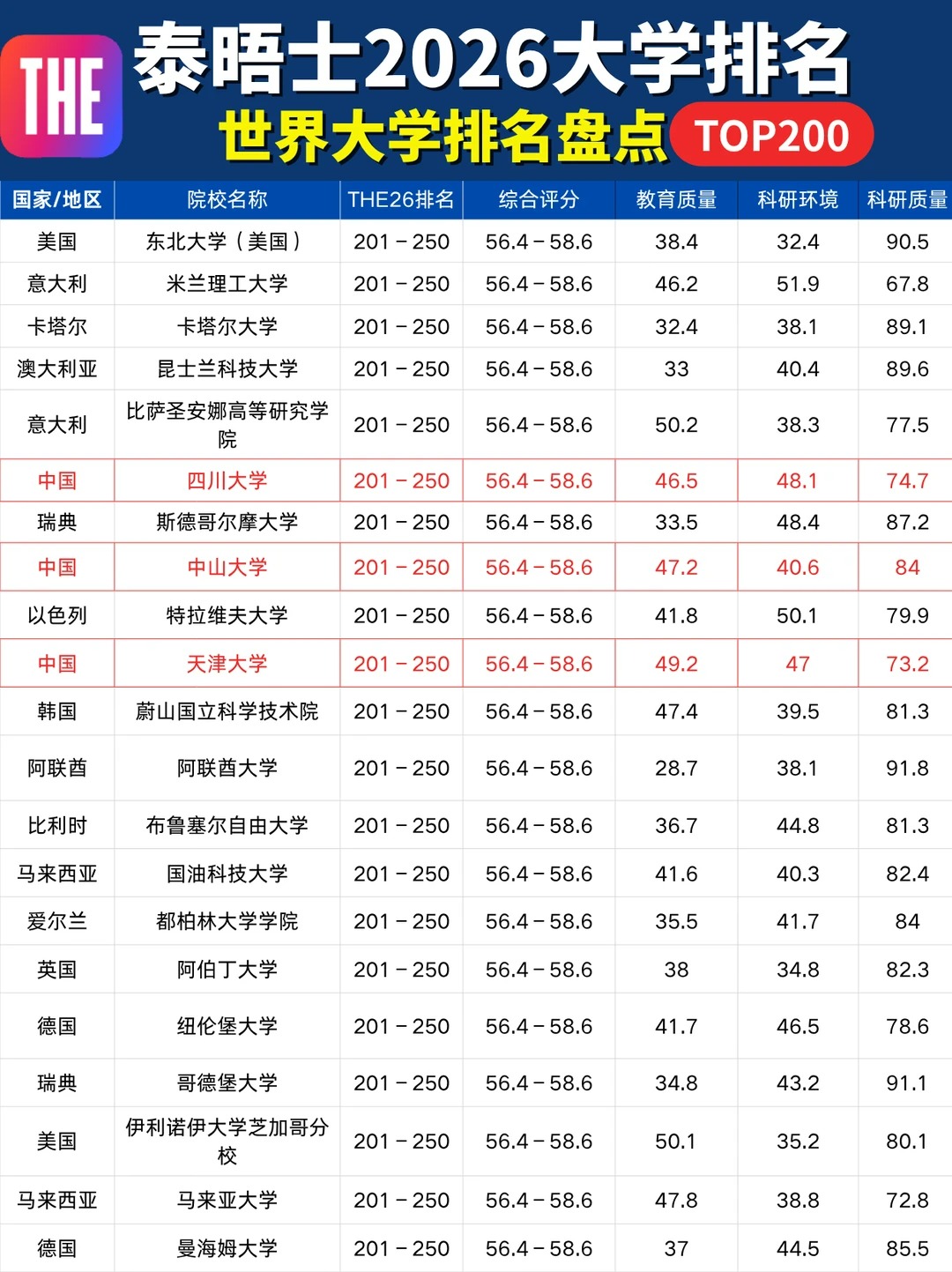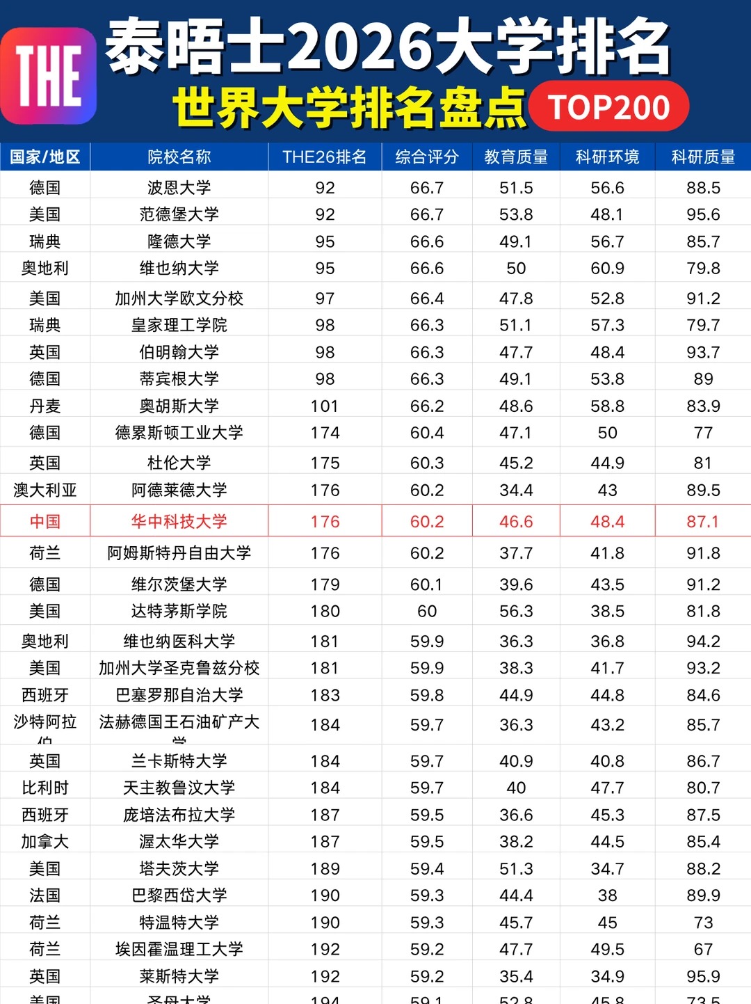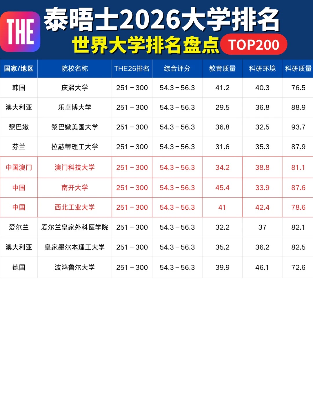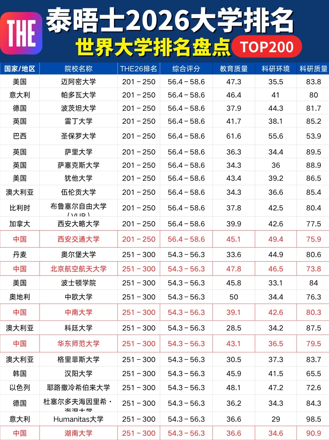 10月9日泰晤士高等教育(THE)更新了2026年世界大学排名!