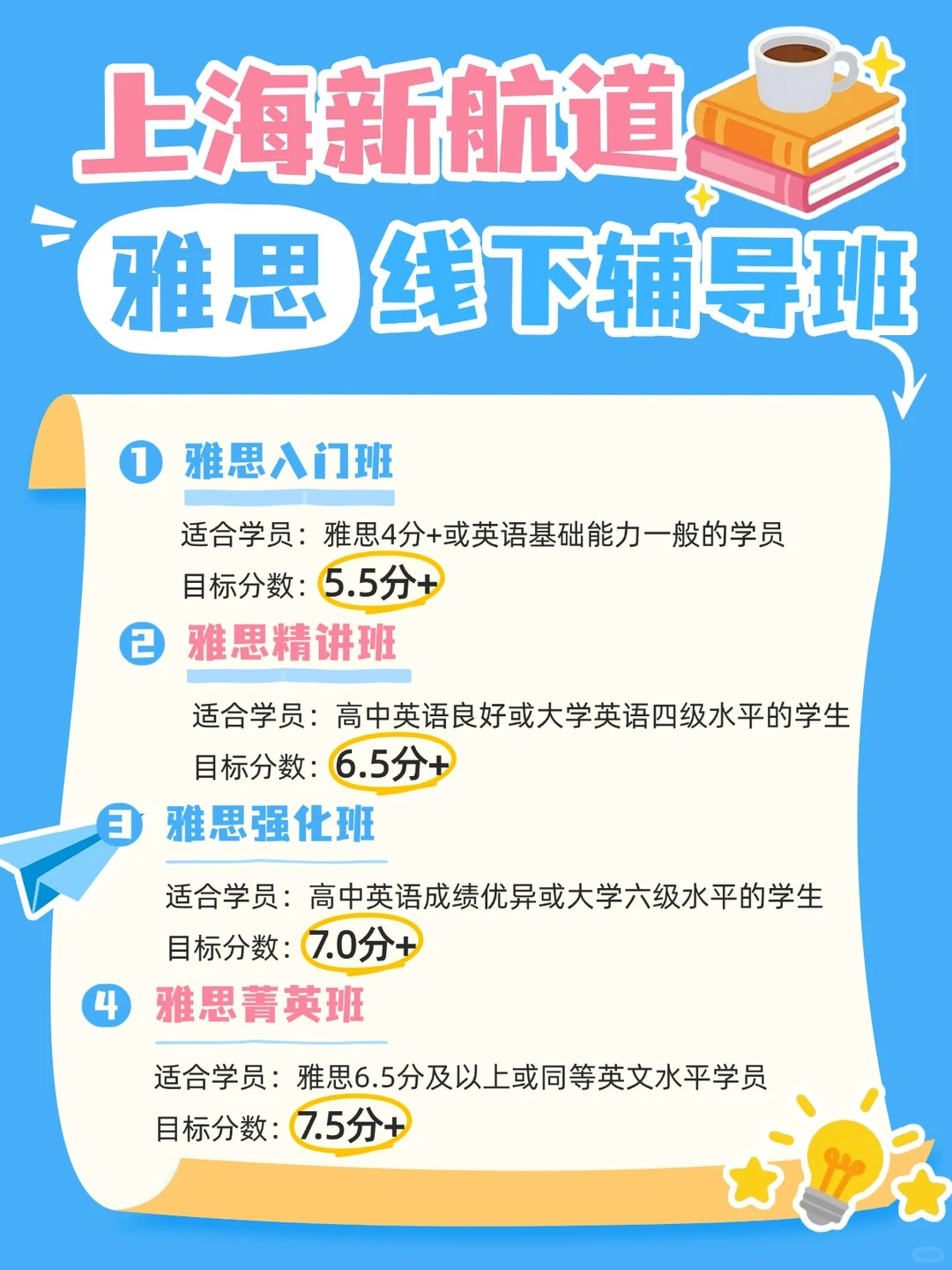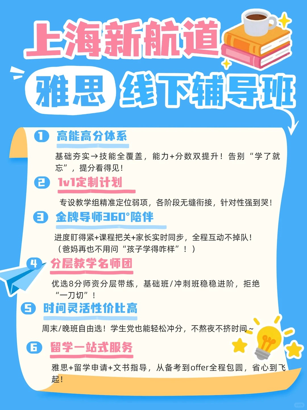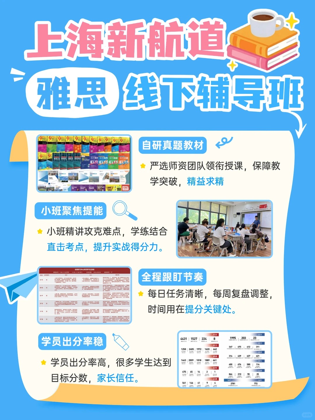 我们凭借“高能高分”的教育理念,切实践行“精品小班 + 全程助 教 + 个性化服务”三大标准,从基础到高分一路护航,能力分数双丰收!