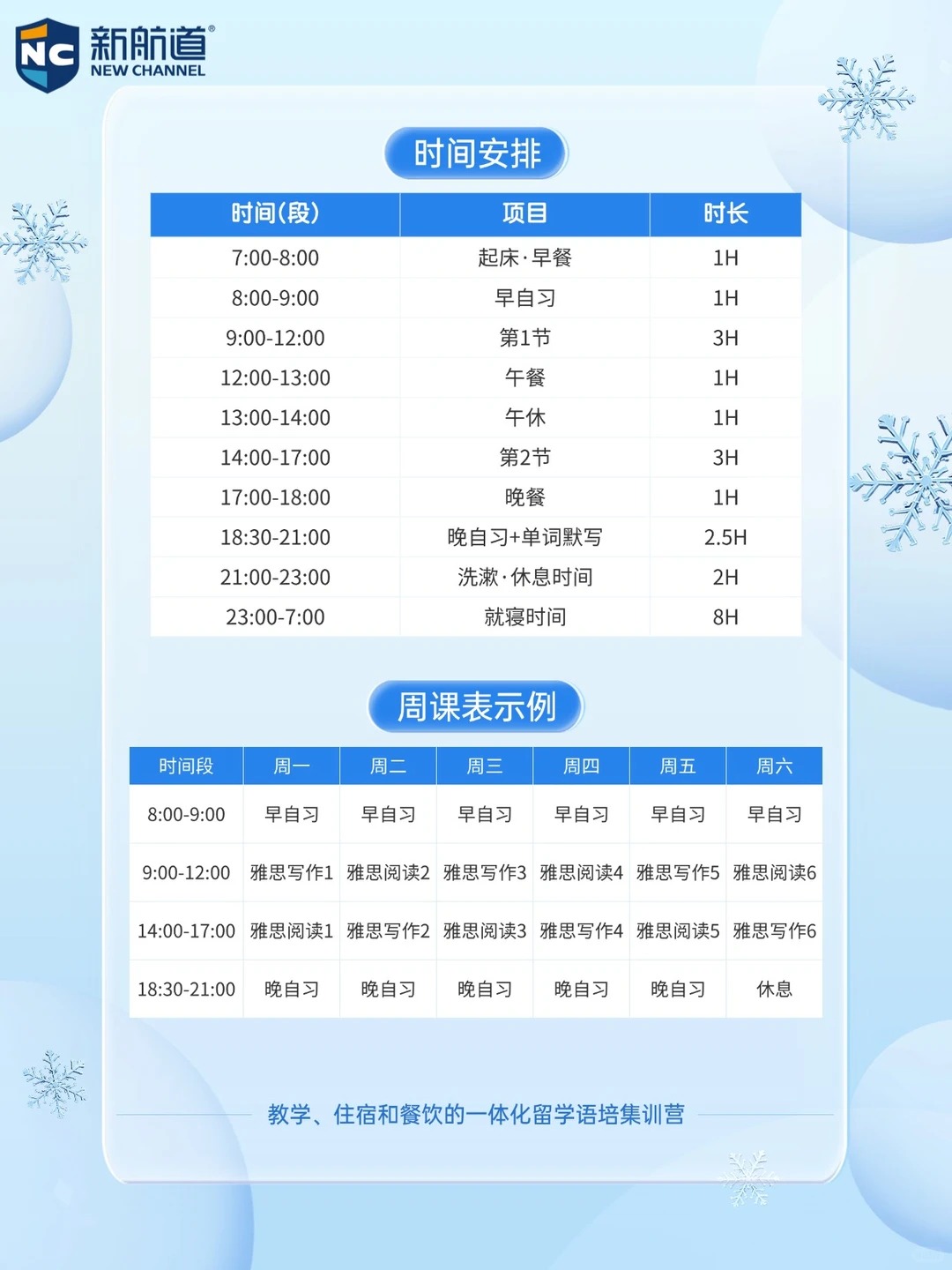 8:00-9:00 早自习(单词+听力热身) ; 9:00-12:00 雅思/托福正课(系统精讲+实战批改); 14:00-17:00 雅思/托福正课(真题拆解+技巧狂飙) ; 18:30-21:00 晚自习+单词默写(辅导练习,班主任1对1盯进度) ; 23:00-7:00 就寝(保证睡眠,拒绝熬夜秃头!)