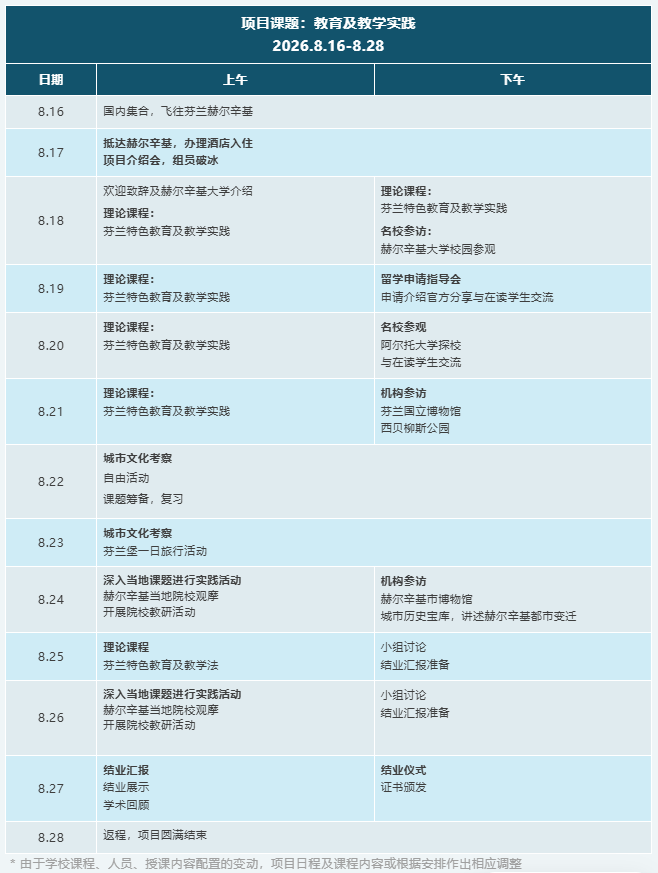 摘要:想亲临全球教育第 一的芬兰,沉浸式体验赫尔辛基大学的顶 尖课堂吗?2026年暑期“教育及教学实践”官方学术课程正式开放申请!8月16日至28日,你将走进芬兰排名第 一的赫尔辛基大学,聆听在职教授解读芬兰教育体系的奥秘,深入当地院校观摩教学实践,探访阿尔托大学,感受北欧创新教育生态。从现象式学习到校企共创,理论与实践深度融合,带你解锁“教育奇迹”背后的核心密码。名额仅20人,开启你的北欧学术之旅!